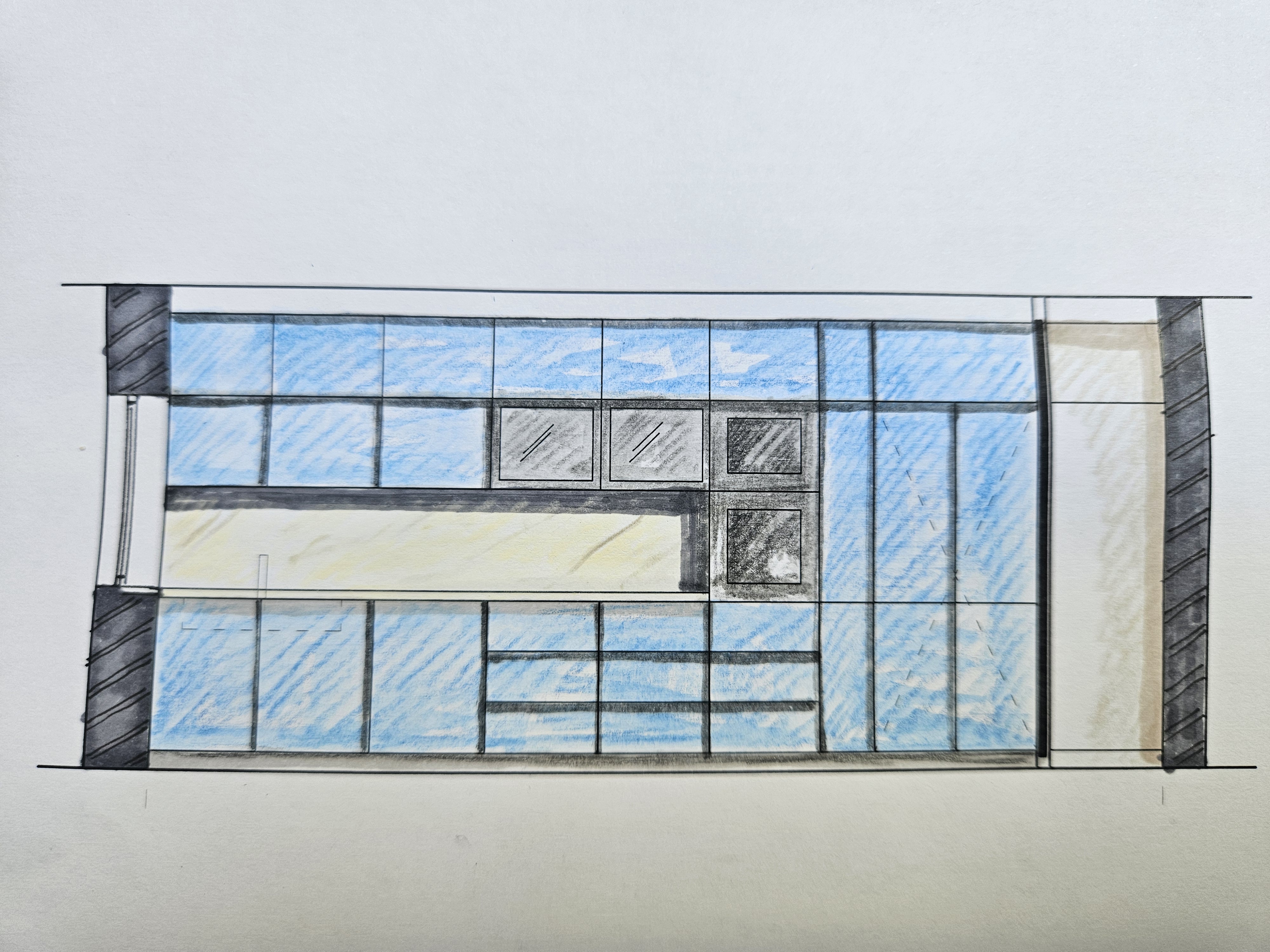 modern internal kitchen elevation blue grey units under cupboard lighting microwave and oven stack