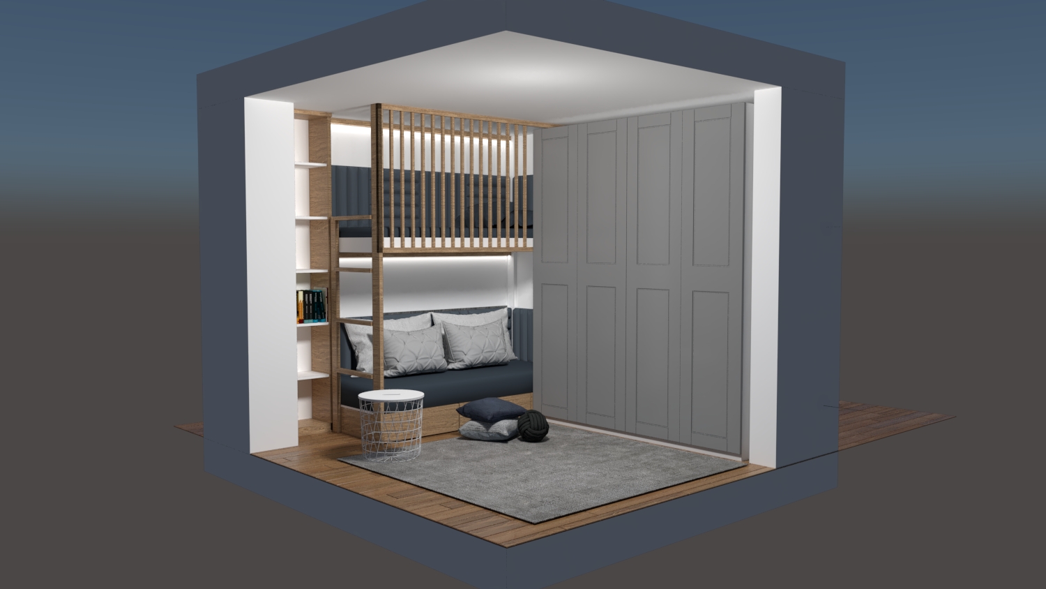 a cozy modern room with a wooden floor and a comfortable atmosphere the wall panels and large cabinet doors are painted in soft gray the shelves are filled with books in lighter color and sculptoral shapes and have a warm wooden texture ther is not lights inside the shelves a dark blue sofa with decorative pillows in various shades of gray and blue sits beside a small round white side table the floor is accented by a light gray textured rug ambient lighting provides a warm and inviting glow creating a serene and peaceful environment do not put lights in shelves do not put the room in another room