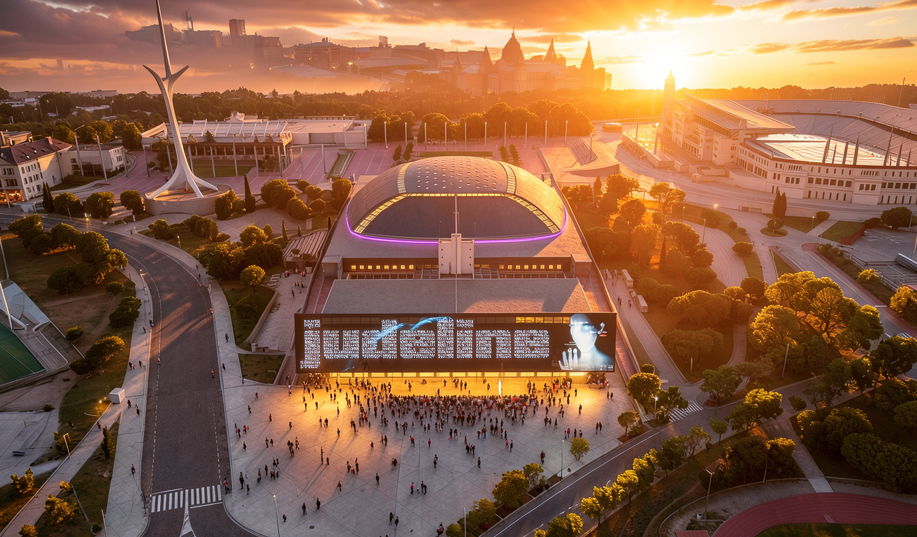 make the image at night pero viendo los edificios with people entering the building remove the road and make a street with people walking
