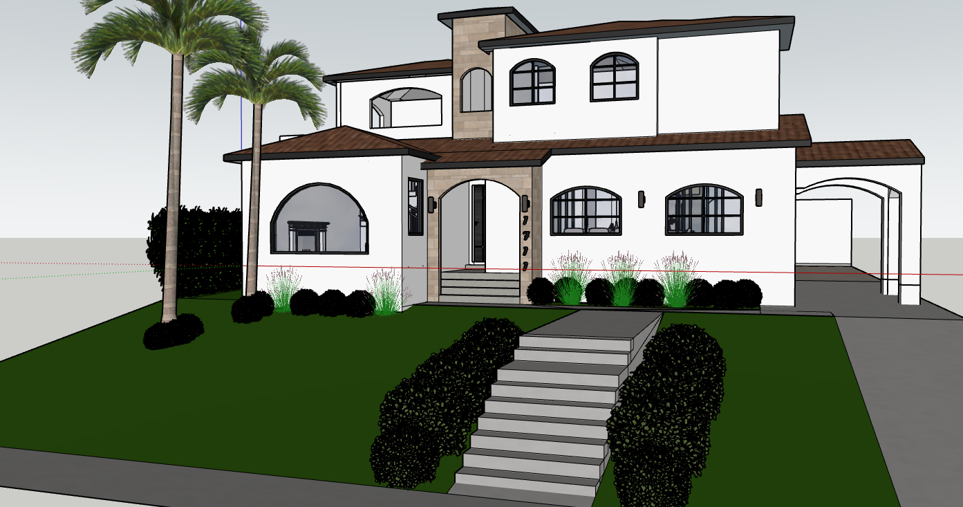 make the house white middle section light color stone veneer all window and doors black frames under eave black beams
