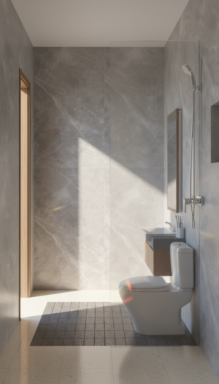 a spacious minimalist room with large floor to ceiling windows overlooking a serene ocean view the interior is bright and airy featuring smooth white walls and ceiling dotted with soft warm recessed lights the floor is made of light oak wood providing a natural and warm contrast to the room s modern white decor sunlight gently filters through the windows creating a calm atmosphere with reflections on the sleek white countertops the overall mood is peaceful and inviting with a perfect balance between modern design and natural beauty
