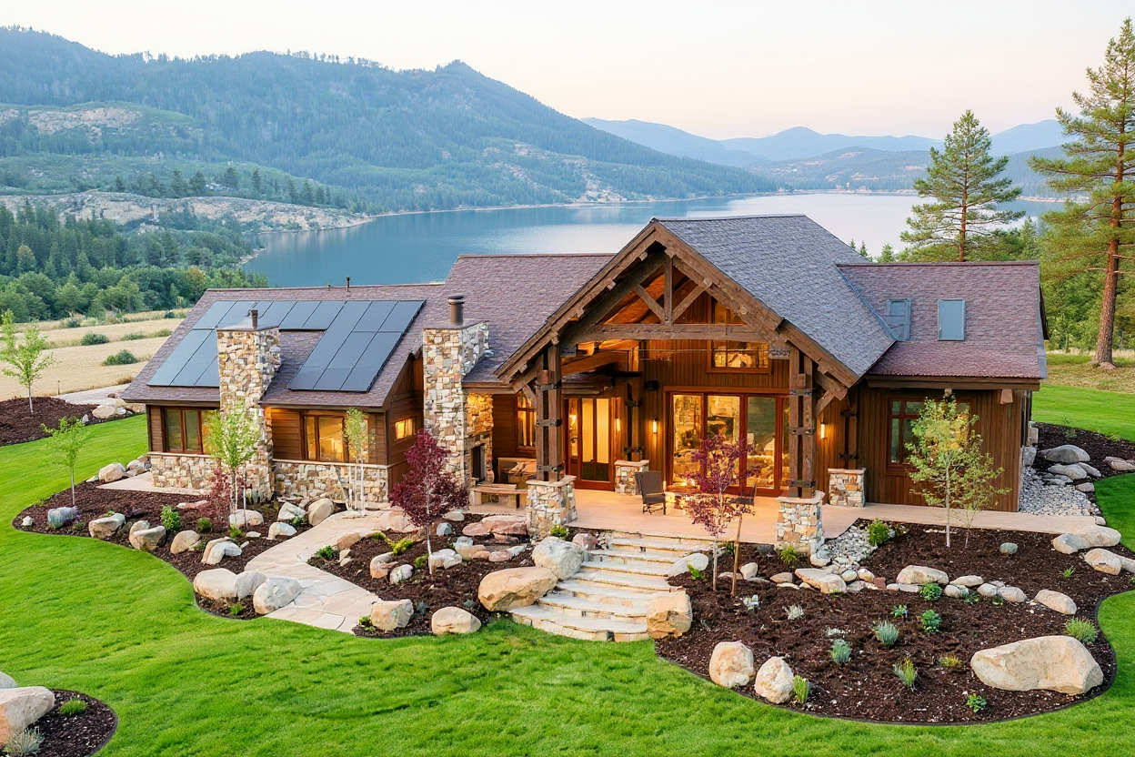 a picturesque rustic cabin set in a serene mountainous landscape the cabin features dark wood beams and stone walls in earthy tones of brown and gray complementing the cozy feel the roof is a sleek dark slate color emphasize warm inviting lighting glowing from inside the cabin creating a welcoming atmosphere surround the cabin with lush green grass and strategically placed rocks in shades of beige and tan in the background capture the soft blue and green hues of distant mountains enhancing the tranquil setting the atmosphere is peaceful and inviting ideal for a tranquil getaway in nature