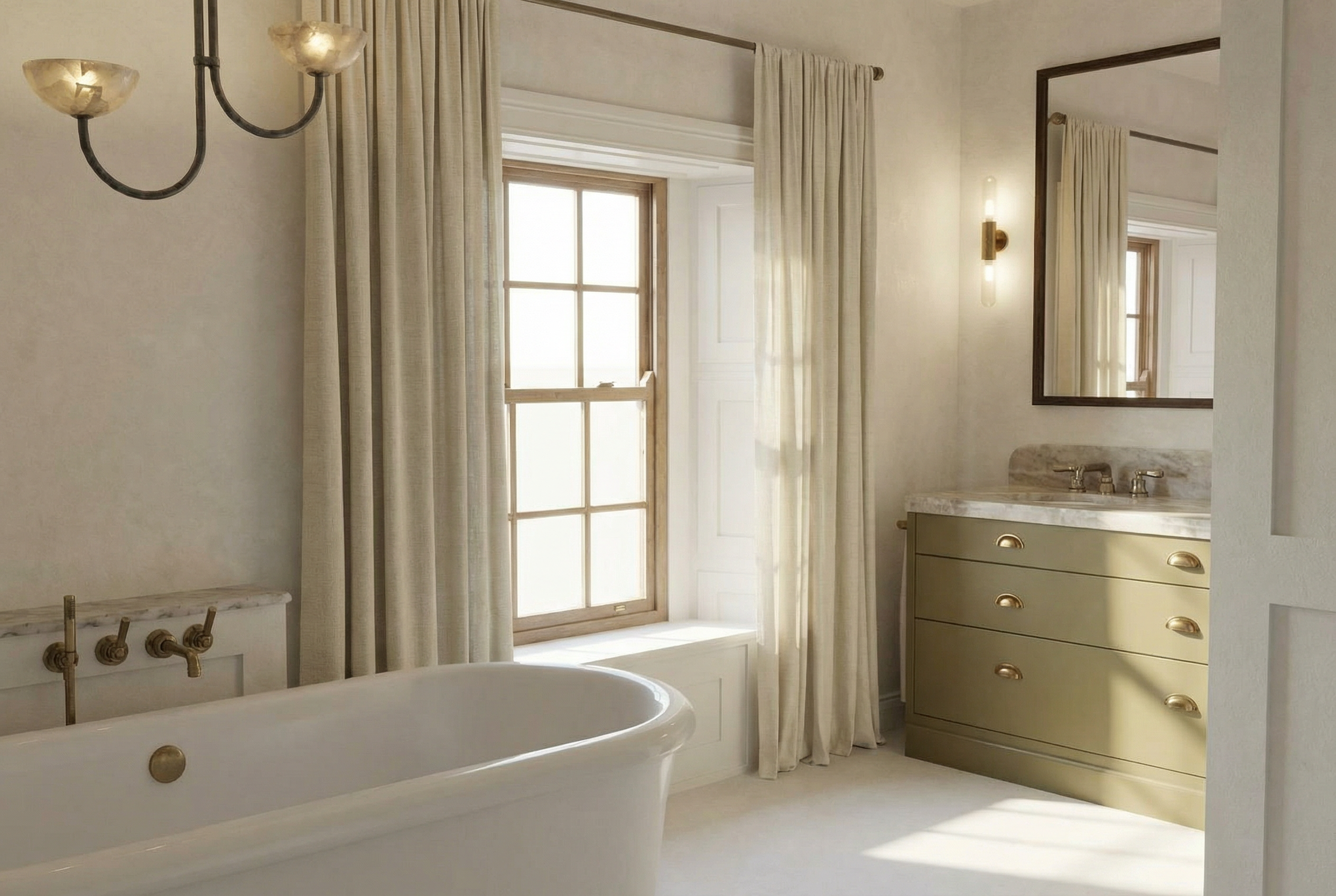 make handles on vanity oval shaped bronze knobs paint window frame off white as shutters make floor dark stained pine floorboards make brassware near bath polished nickel