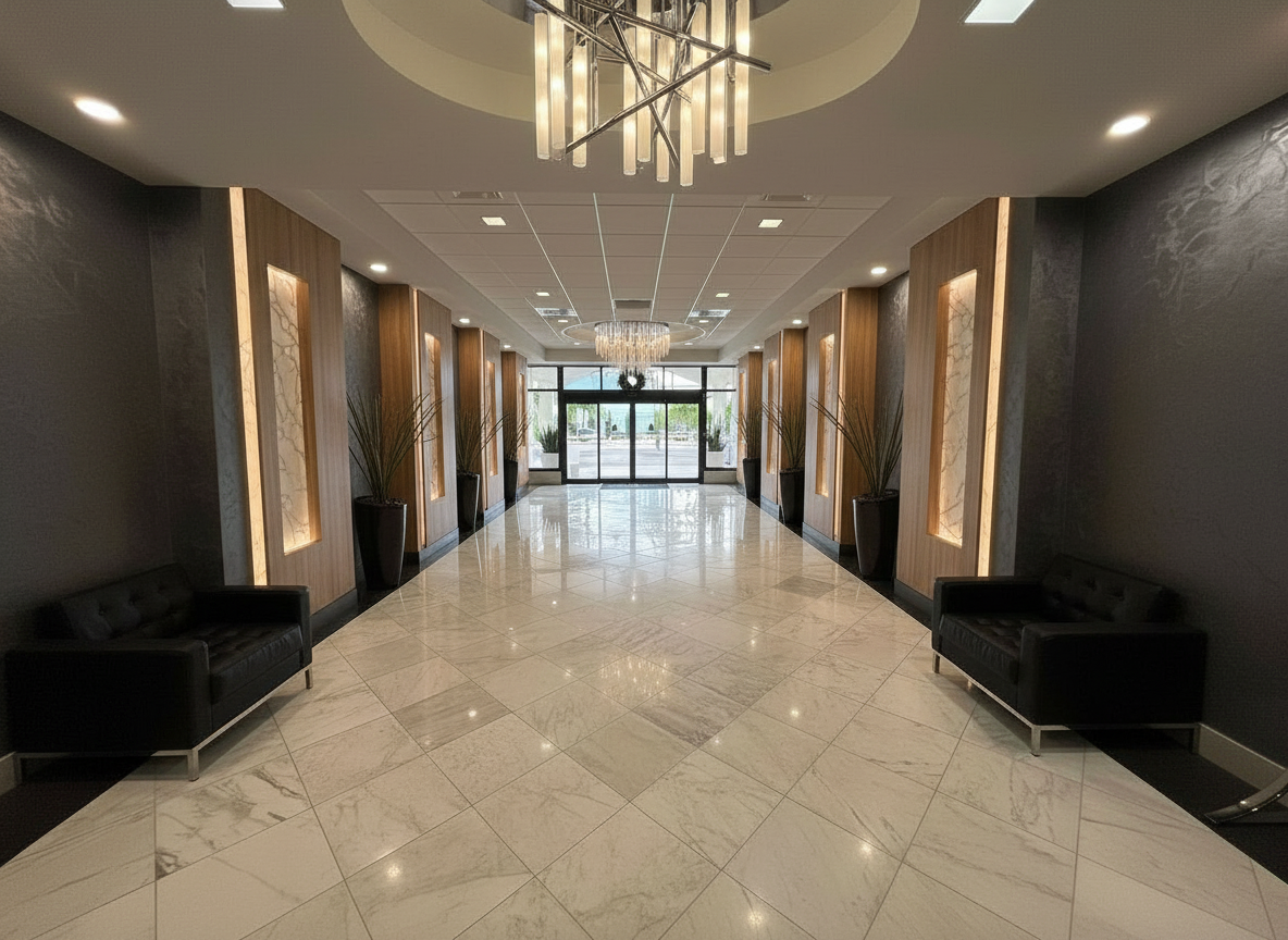elimina las flores rosadas del piso y modifica la l mpara ubicada al fondo adaptando su dise o materiales y proporciones al estilo y acabados que se proponen para las paredes interv n nicamente las paredes explorando acabados texturas o colores que aporten personalidad y elegancia al corredor las aperturas pueden ser de otra forma nichos o paneles de tonos claros y la paredes adicionar algun elemento generando inter s visual y profundidad y que no se vea plano ni tenga circulos