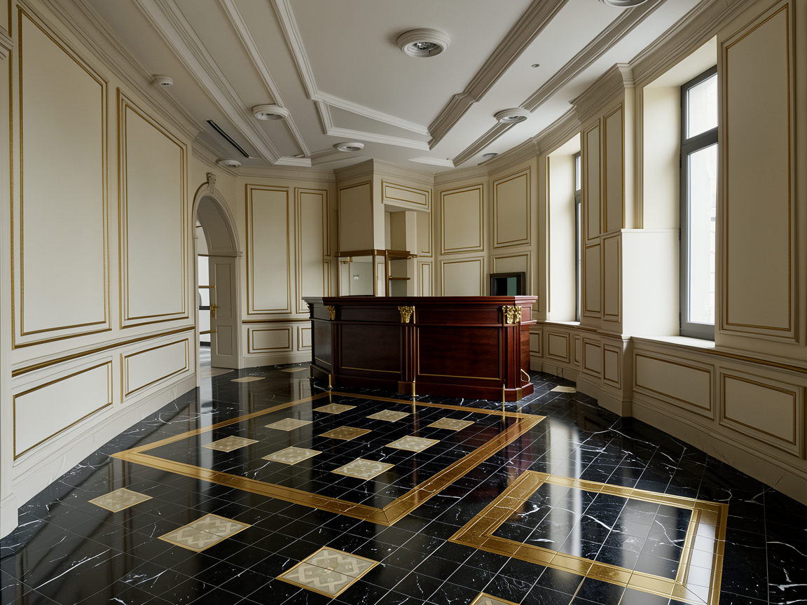 take the existing hotel bar and strip it completely to its bare architectural shell remove all furniture fixtures finishes paint paneling flooring ceiling details and decorative objects keep only the walls ceiling floor structure and window and door openings intact preserving all proportions and geometry exactly do not move add or remove any openings then renovate the space strictly following the luxury design style established in the previous restaurant scene walls moldings apply warm ivory and cream wall paneling with geometric linear classical moldings and subtle gold trim exactly matching the paneling style proportions and detailing from the restaurant scene no floral organic or rounded motifs ceilings install high coffered ceilings consistent with the refined classical modern style from the restaurant scene with restrained linear ornamentation and subtle gold accents flooring lay high gloss geometric black and cream marble with polished brass inlays using strictly diagonal lines and rectangular intersections exactly in the style of the restaurant floor veining and reflections should convey luxurious high end materiality windows doors preserve all windows and doors exactly as in the source image maintain frames mullions and glazing do not add drapes curtains or alter any openings bar counter only stage a single modernized old money bar counter in dark polished wood with brass detailing as the only furniture element do not add any other furniture seating tables or accessories anywhere rendering atmosphere render ultra photorealistically maintaining the warm luxurious restrained aesthetic from the restaurant scene including material textures wall and floor reflections and ceiling details correct perspective distortion straighten verticals and horizontals and preserve the original spatial proportions overall goal produce a fully stripped and professionally renovated hotel bar shell with all architectural finishes walls ceilings floors windows rendered exactly in the established restaurant style and only the bar counter staged no additional furniture props drapes lighting or decorative elements are added and the original room layout and openings remain exactly as in the source image