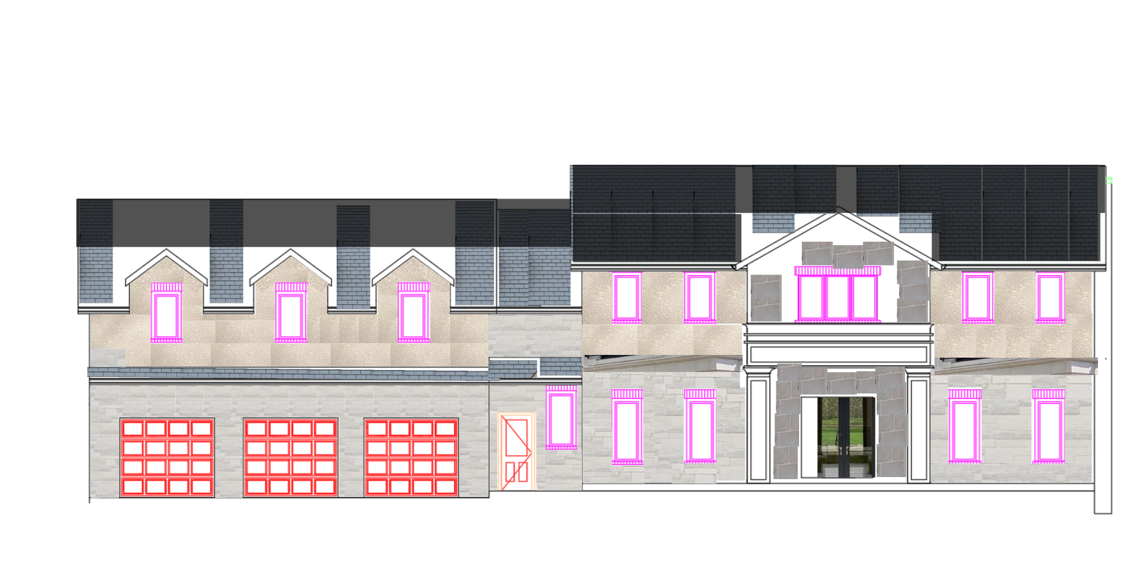 render this residential house elevation with a light and airy aesthetic first floor indiana limestone stone cladding soft light gray tone second floor smooth light stucco finish in off white cream porch remove the wrap around porch instead design a tall two story front porch framed in indiana limestone extending up to the second floor with elegant vertical columns roof medium gray shingles windows large modern windows with slim black frames for contrast front entry accentuated with tall limestone columns and a clean lined modern glass door overall mood bright timeless and sophisticated with strong vertical presence and airy curb appeal architecture