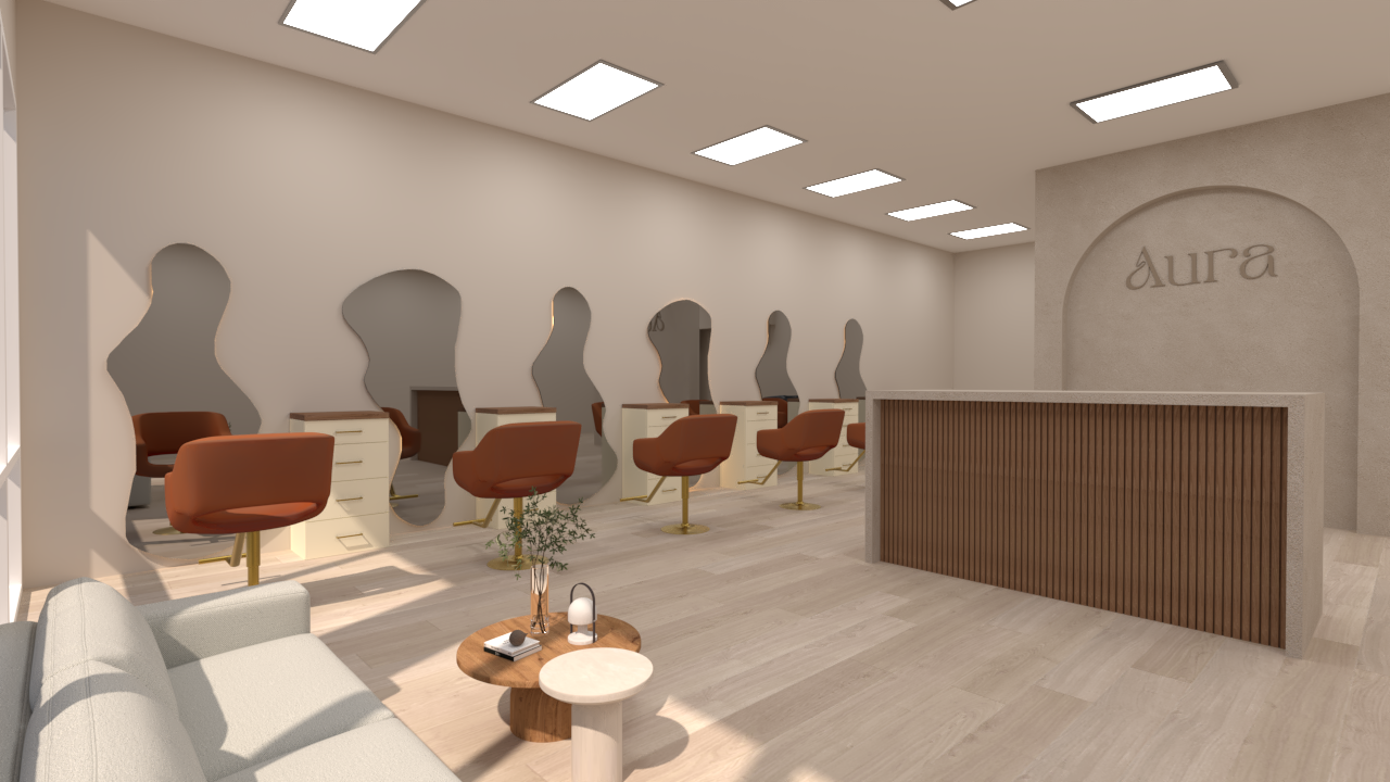 render an elegant salon interior featuring a warm beige color scheme with curved mirrors set against soft taupe walls add stylish comfortable chairs in a burnt orange leather with gold legs incorporate a modern wooden reception desk with a rich brown tone and a cozy seating area with a light beige sofa include natural light pouring in through large windows casting gentle shadows creating a welcoming and tranquil atmosphere use light wood flooring to enhance the cozy and sophisticated ambiance architecture