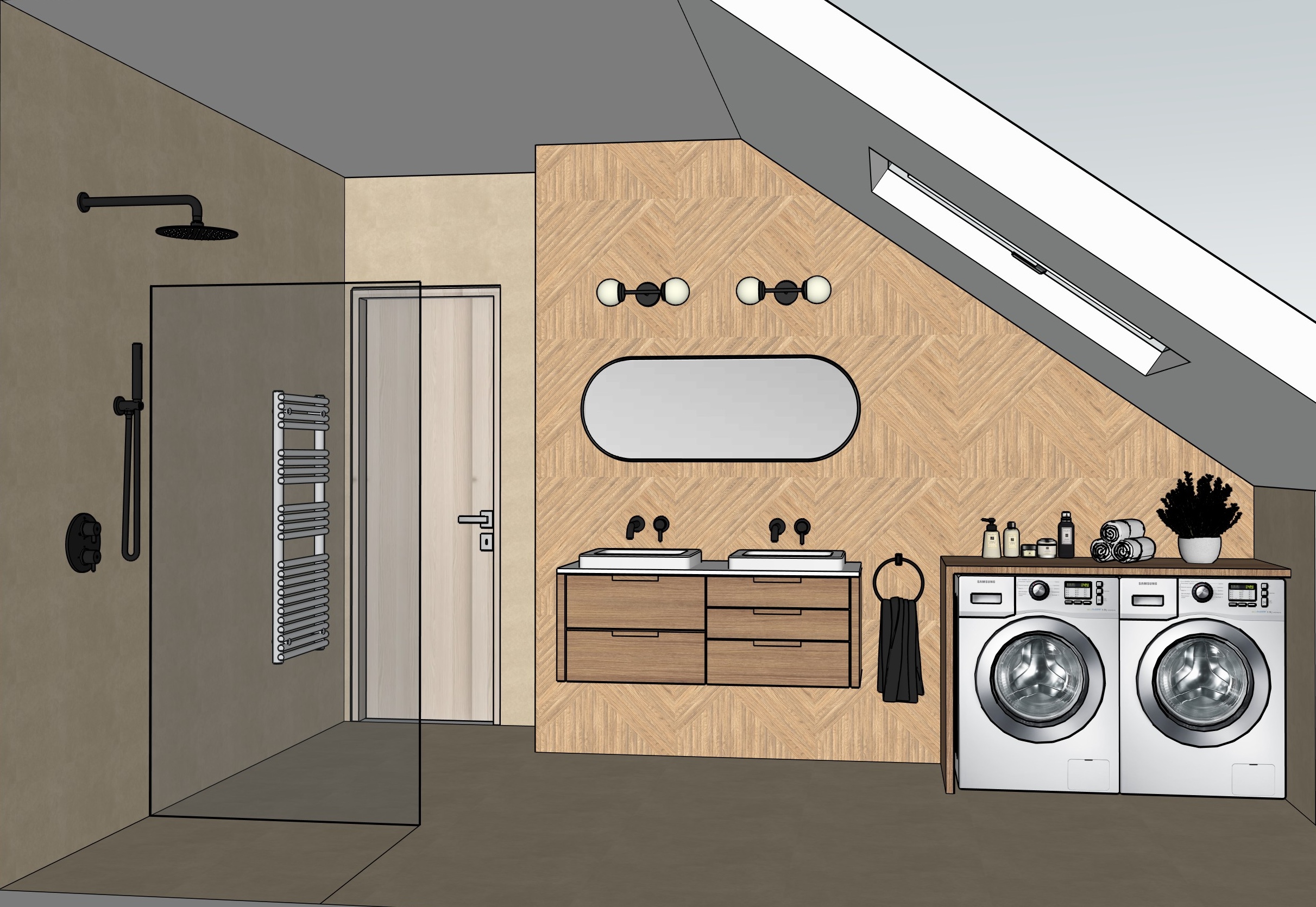 bathroom with beige tiles on the walls wooden pattern tiles behind the mirror same as the original photo