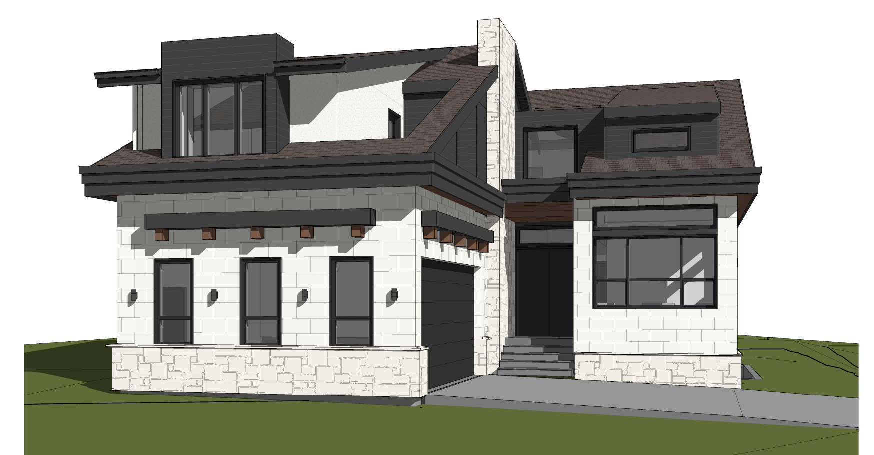 render a modern duplex with a sleek architectural design the roof should be brown shingles and upper walls should be a deep white with charcoal accent siding creating a sophisticated contrast with light reddish walnut wood paneling beneath the eaves front walls are a textured light limestone with a cultured stone veneer base adding an element of natural elegance large windows framed in black accentuate the contemporary style the driveway and pathways are smooth concrete gray leading to a pristine landscape with lush dark green grass the atmosphere is serene and inviting set in a bright clear afternoon with soft natural lighting emphasizing the clean lines and modern aesthetics the home is a transitional style home and the landscaping should be cedars grasses shrubs and some flowers
