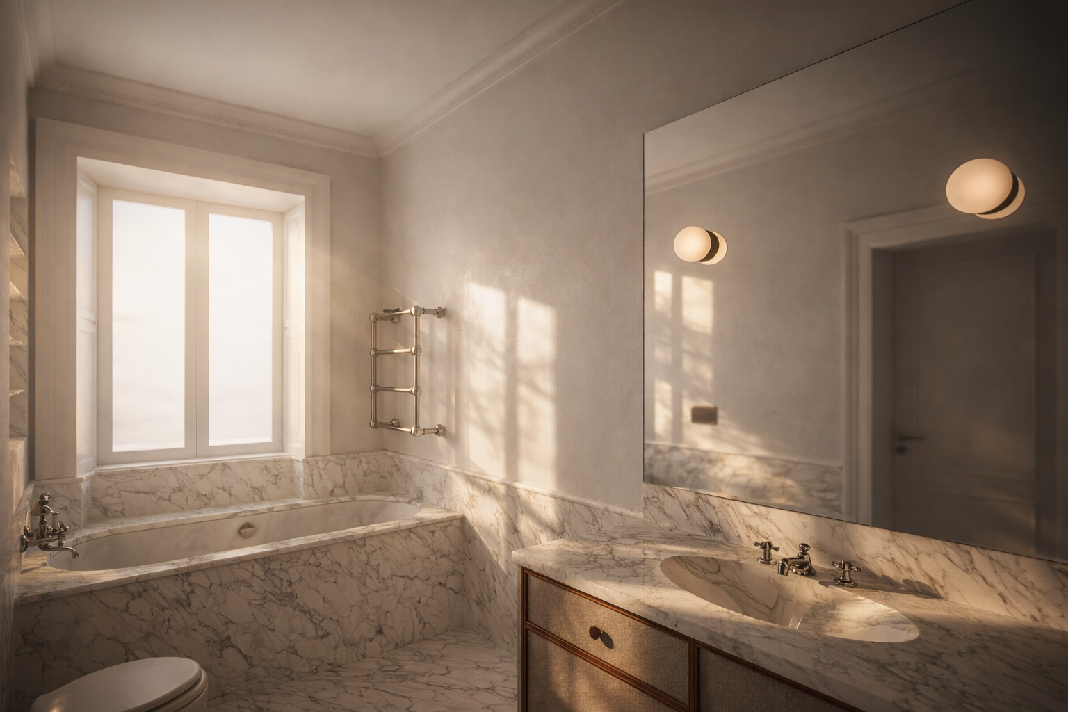 a precise photorealistic interior shot of the marble bathroom from image 0 png viewed from the same perspective all architecture and furniture remain in place the built in carrara marble bathtub under the window the wood and marble vanity unit the mirrored panel wall the round wall sconce and the heated towel rack the crucial modification is to neutralize the entire room s color palette the overall warm brownish beige cast is removed the white carrara marble is now pristine and cool toned with its grey veining sharply defined against a pure white base the walls and ceiling are a clean true neutral white the wall mirrors are crystal clear with neutral reflectivity reflecting the neutral elements and a neutralized view from the window the light from the window while still bright and soft is a neutral daylight not a warm haze all fixtures previously perhaps tarnished or aged brass are polished cool chrome or nickel the scene has a pure clean contemporary classic feel
