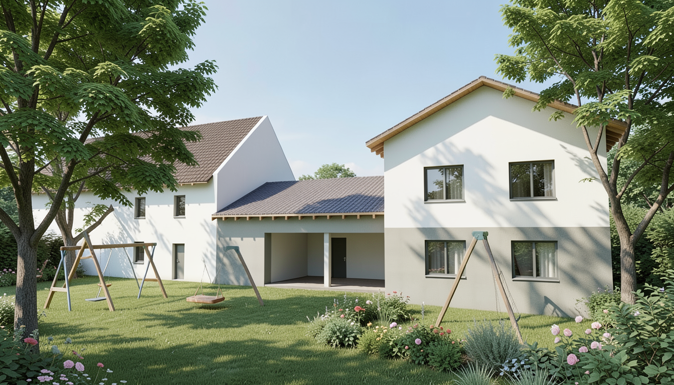 rechts neben dem haus befindet sich in einem 3m abstand eine stra e f ge zwei b ume und str ucher in den garten ein sowie eine spielschaukel
