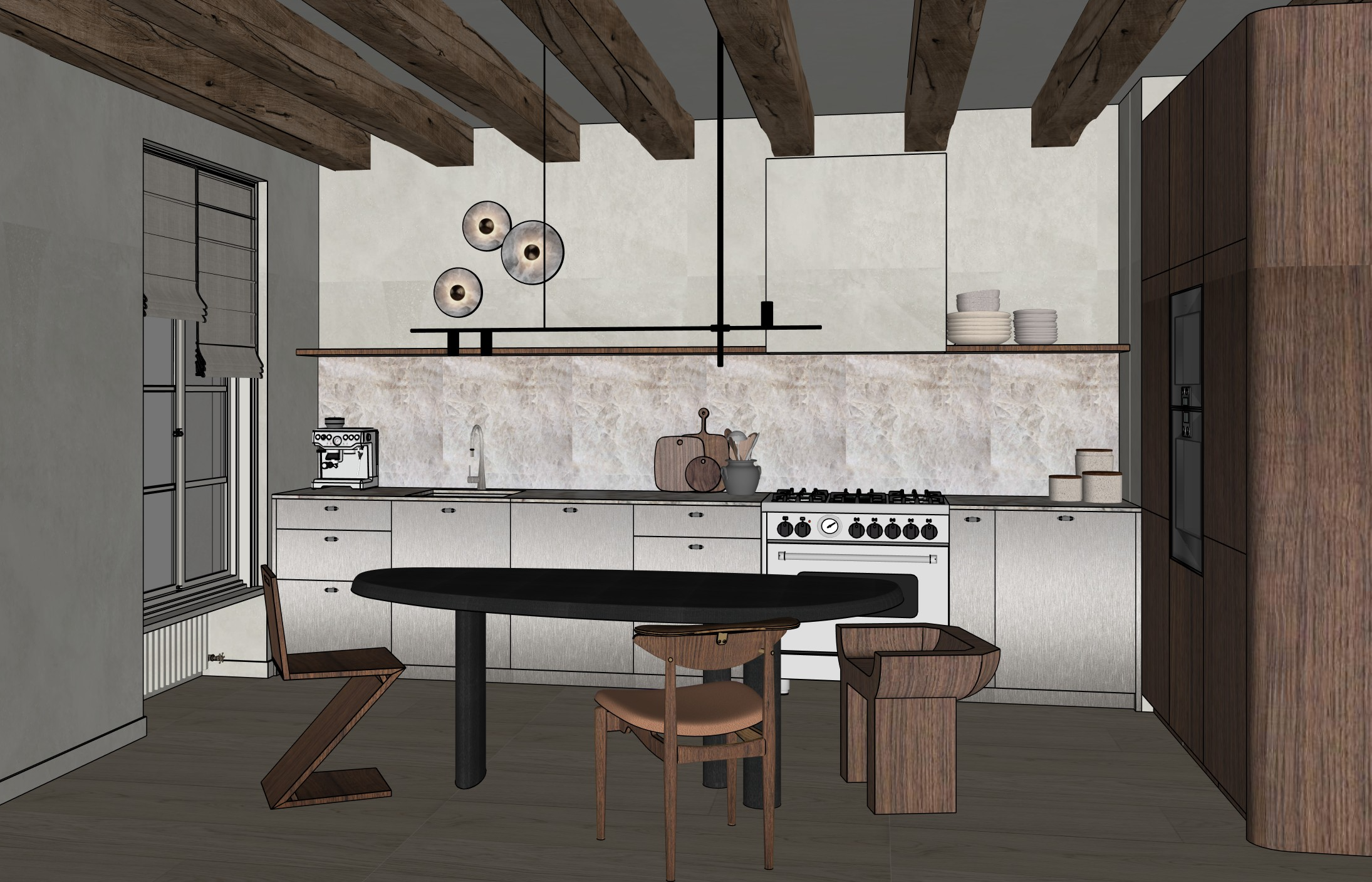 the walls should be lightly plastered the stone is more grey the appartment is in paris on the 3rd floor the stove is a lacanche range in stainless steel the cabinets are in stainless steel but not so shiny the colors of the room should be more beige and a little brighter the floor is in ancient wood the range hood is the same color as the walls and is lightly plastered add some subtle lights under the shelf style the space like colin king
