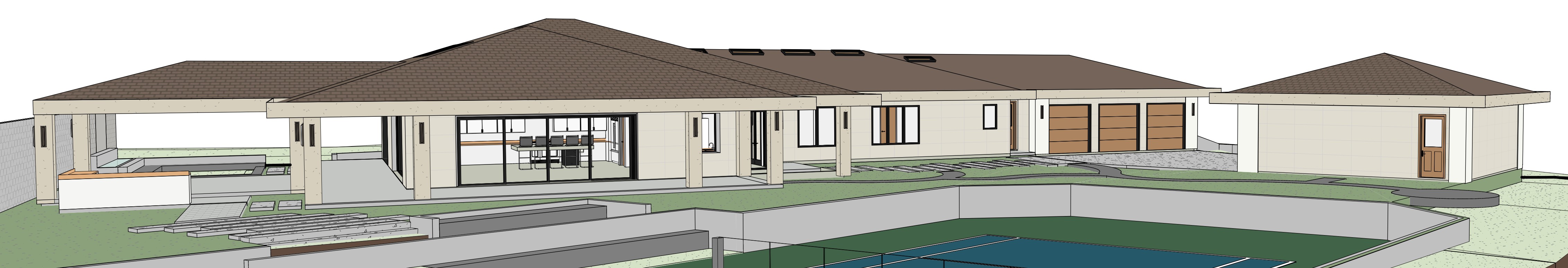 render a photorealistic 3d perspective of this house camarillo ca reference the current material style just enhance the slate tile charcoal brown blend roof travertine stone smooth stucco in columns and roof eave channeled cut stone in corners concrete walls and pathways on site model geometry the same windows doors roof walls garage door pavement driveway make a lush vegetation that looks native to camarilla ca do not change the view only enhance the current materials and make the landscape nicer vegetation detailed textures in finishes and glass reflections and a vibrant clear sky with light atmospheric depth render in hyper realistic architectural visualization quality 8k resolution