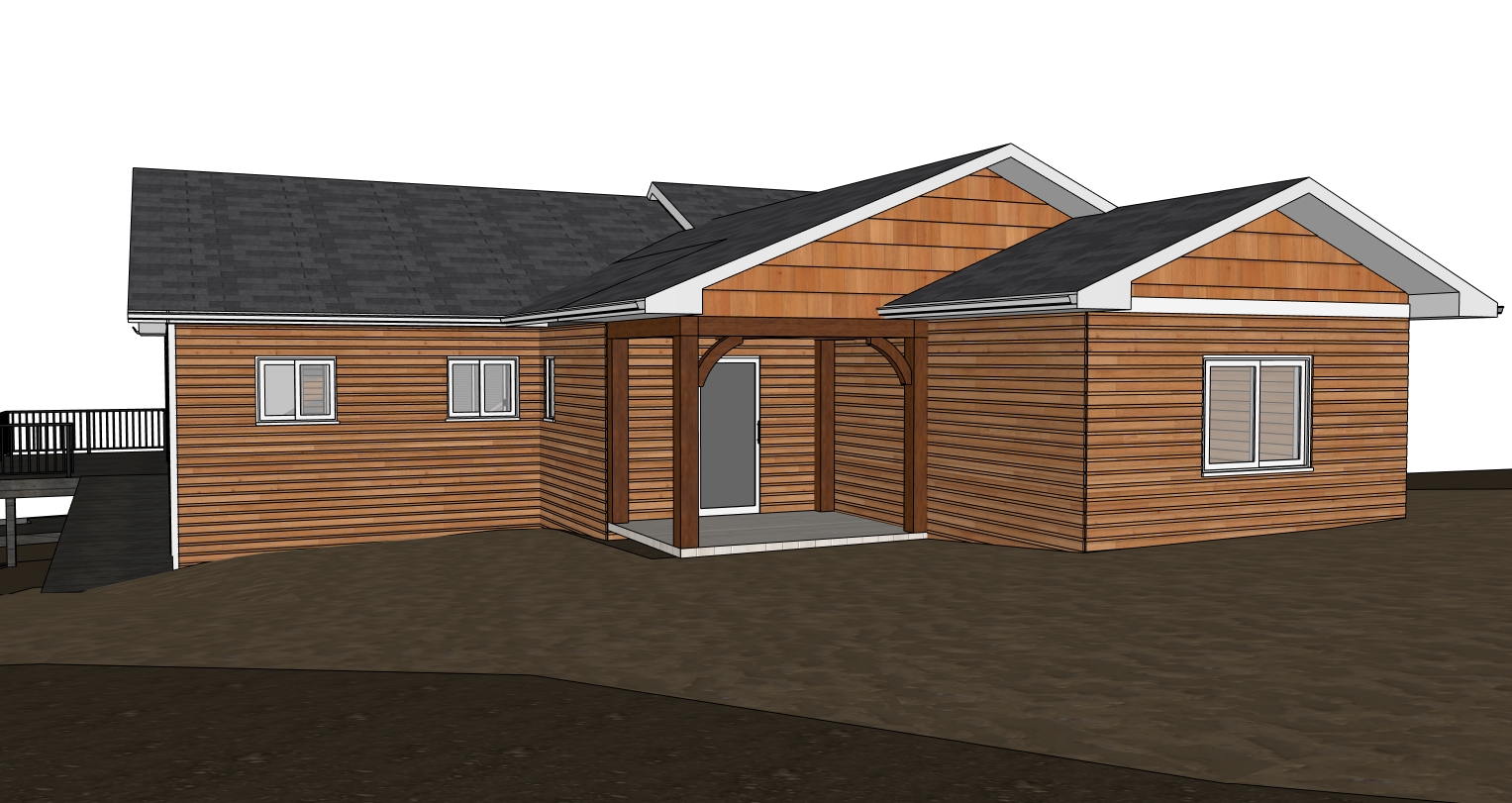 house is lakefront in cabin country surrounded by spruce pine fir birch and poplar lake is in the background wiht another shore visible in the distance sun is setting in the background
