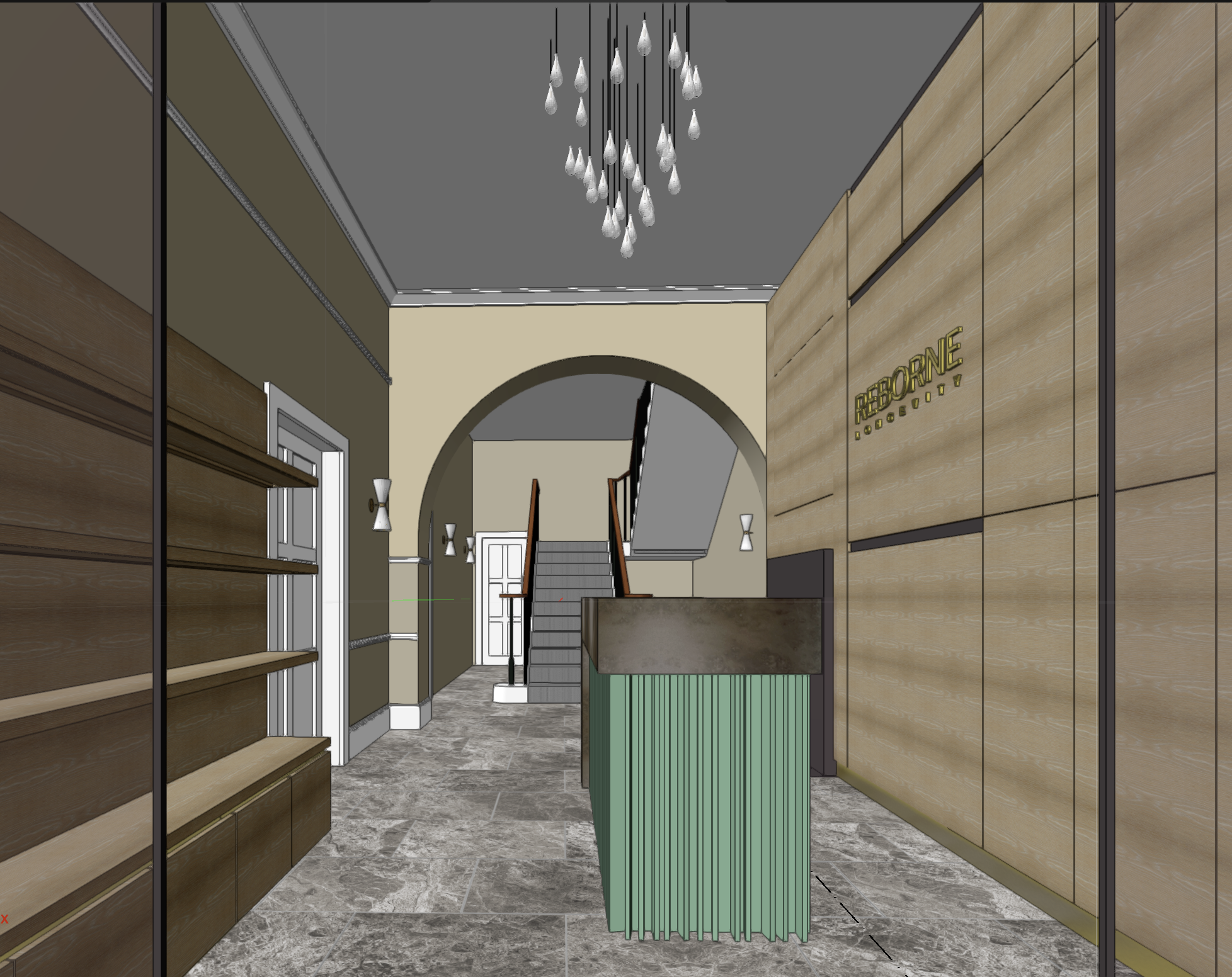 photorealistic architectural interior photograph of a refined wellness clinic reception warm soft natural daylight entering from behind camera combined with subtle concealed ambient lighting and elegant decorative pendant lights materials appear fully finished and premium natural oak wall panelling with refined grain honed stone floor tiles with soft reflections painted plaster walls with gentle texture brushed metal detailing and a sculptural reception desk with vertical ribbed panelling and stone countertop space feels calm welcoming and contemporary while respecting historic proportions with a balanced mix of modern design and classical architectural elements such as the arched opening and staircase lighting is realistic and atmospheric with soft shadows global illumination and accurate material response camera at human eye level wide angle architectural lens 24 28mm straight verticals professional interior photography composition no people no clutter no construction elements no temporary fittings ultra high resolution realistic textures natural colour balance editorial architectural photography style