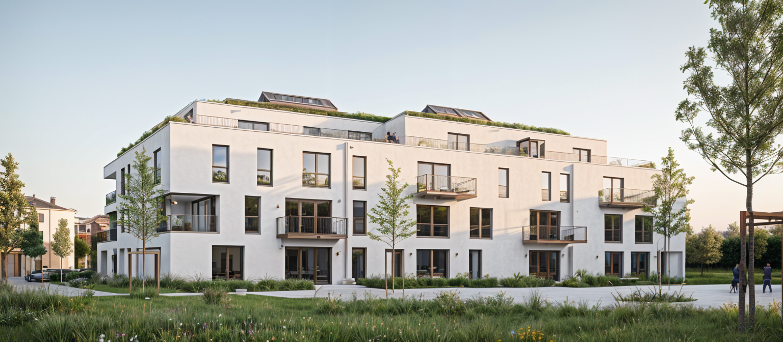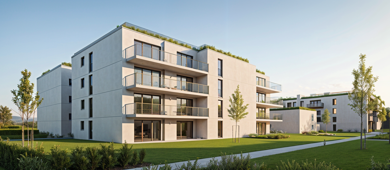 lot of light and reflects in the windowsmetalic facade and plastering in the hills of switzerland lauriers gras lot of sun some swiss pain trees on the background