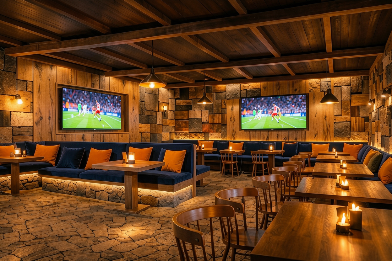 open the left wall exactly double the width occupied by the tv completely remove that portion of the wall wood and cladding and replace it with a double door with 2 sliding panels the door should be full height from the top edge of the backrest of the sofa up to the ceiling the glass window must have a thin black iron frame an elegant and contemporary vertical division of the 2 glass panels a realistic external view of an evening night mountain landscape depth natural lights atmosphere consistent with the internal lighting perfectly maintain consistency of internal lighting and reflections on the glass the warm and cozy atmosphere of the room do not modify anything else furnishings tables chairs sofas floor ceiling and beams remaining walls and their texture strip and tv on the front wall proportions framing and general lighting