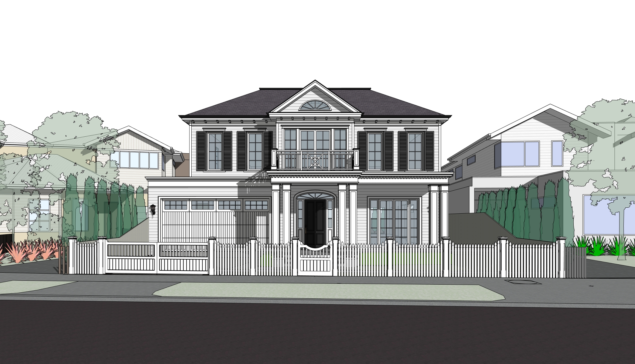 a high end residential architectural visualization of a classic american colonial style home the design features symmetrical proportions a steeply pitched gable roof with dormer windows and a welcoming front porch with square white columns style traditional colonial architecture with modern refinement clean elegant and timeless photorealistic rendering with soft natural daylight subtle shadows and a slightly warm tone to enhance materials colour palette main exterior soft warm white off white weatherboard cladding white front fence trim and detailing crisp white for fascia columns and window frames window shutters matte black for strong contrast roof dark grey slate tile with natural variation accents neutral stone and light concrete tones for driveway and pathways matte black front door white garage door landscaping lush green lawn with deep green shrubs no shrubs in front of the front fence material scheme exterior walls horizontal timber weatherboard painted smooth finish roof asphalt or timber look shingles with fine texture windows white painted timber frames with clear glazing shutters timber painted black with a matte finish porch columns painted timber or composite with a smooth satin finish base skirting subtle stone or rendered finish in light neutral tone driveway exposed aggregate concrete with a natural slightly warm tone path edging light stone kerbing with clean lines lighting environment bright daytime setting with soft sunlight from a slight angle wet road clear blue sky with minimal clouds realistic soft shadows to emphasize depth and architectural details rendering details ultra realistic textures pbr workflow high resolution output 4k or higher balanced contrast and sharpness slightly softened highlights wide angle perspective slightly eye level 3 4 view subtle depth of field for a polished professional look