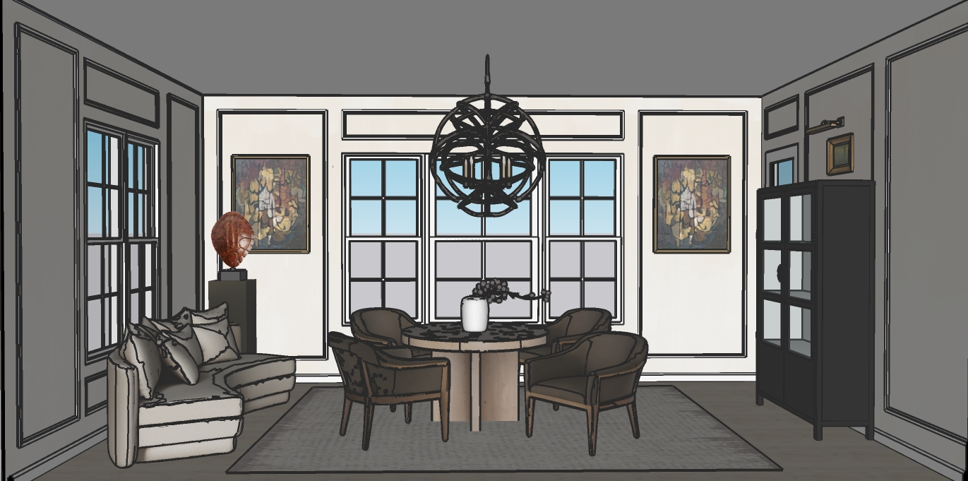 the rug is a grey brown color with a pattern the floors are an oak color the table is light oak wood the chairs are a brown olive fabric with wood legs the walls have a subtle greige limewash paint on them the outside environment is trees and a yard on the left side of the partial wall there are navy base cabinets with white quartz countertops and white wall cabinets
