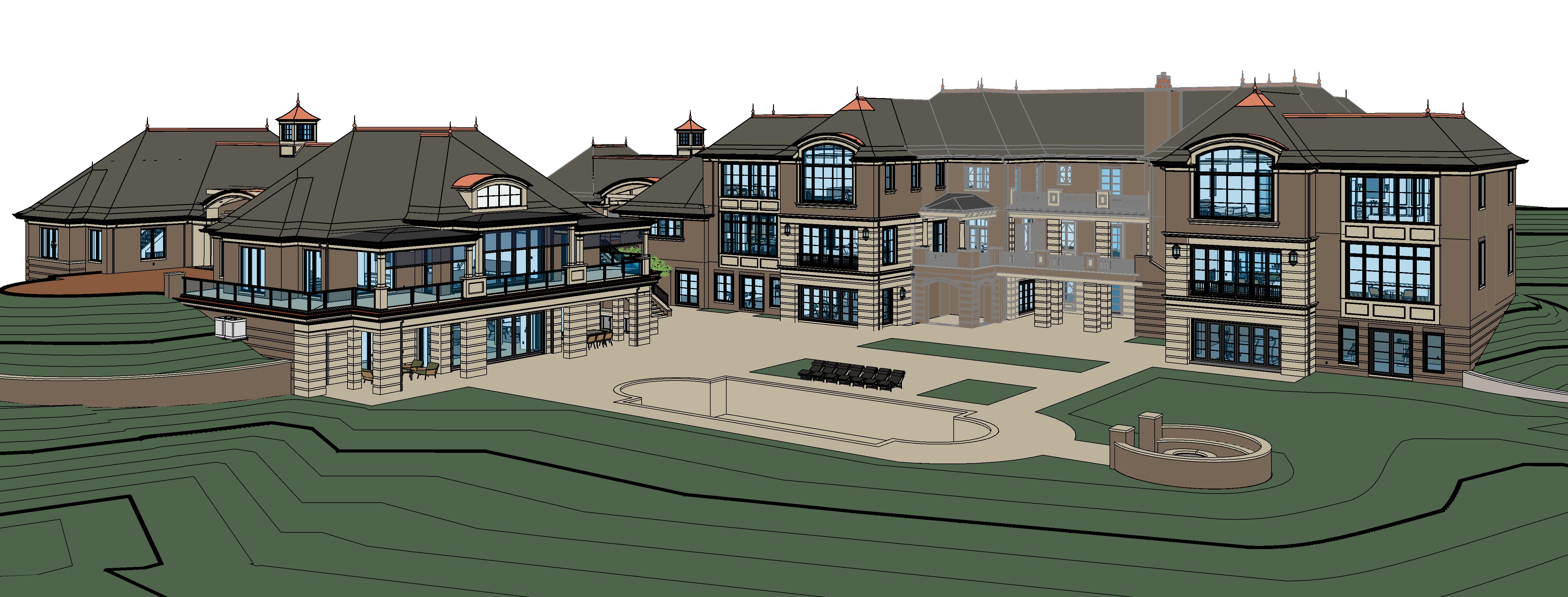 render a high quality photorealistic exterior 3d view directly from the provided revit model absolute requirement preserve all existing architecture massing geometry openings proportions and material locations exactly as modeled no changes to building form or material boundaries are permitted roofing primary roof surfaces must remain architectural asphalt shingle roofing as shown copper roof elements must remain copper exactly as modeled standing seam accents or specialty roofs do not replace shingles with metal do not recolor or reinterpret copper elements masonry locked lower veneer smooth honed travertine with clean recessed reveals exactly as modeled upper veneer brick veneer exactly as modeled same color coursing scale and mortar expression no material substitution no pattern changes no texture exaggeration pool add clean realistic water to the pool water should appear calm with subtle reflections and realistic depth pool deck hardscape creative allowed you may creatively enhance the pool deck and surrounding hardscape use high end modern materials such as large format concrete pavers limestone porcelain pavers or smooth architectural stone clean geometry tight joints minimal patterns add subtle transitions between materials and integrated pool coping keep design restrained modern and consistent with a luxury residential aesthetic landscaping add minimal intentional landscaping lawn low shrubs ornamental grasses sparse trees landscaping must support the architecture and hardscape not dominate it lighting neutral natural daylight with soft shadows balanced exposure and clear material reads