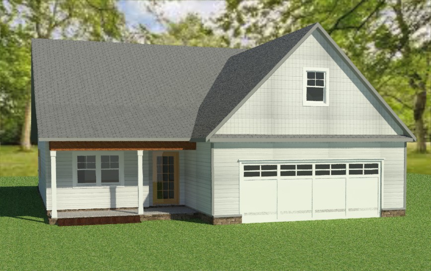this is a house with horizontal siding but has vertical siding on the top of the garage wall the roof is asphalt shingles the porch has dark wood posts and beam the front door has glass add a concrete driveway from the garage door and a stone path from the driveway to the porch add trees and plants to the background the sun its from the sun and there is a sunset add light fixtures to both ends of the garage wall