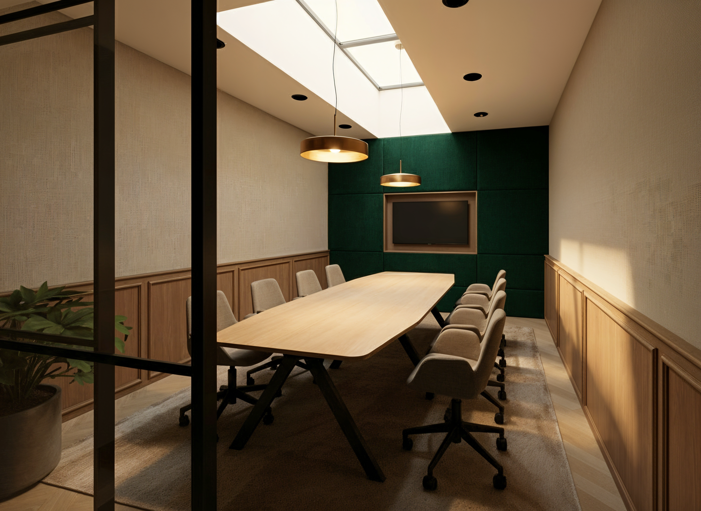 de prompt voor archsynth high end interior design photorealistic architectural photography sharp details 8k resolution dining area featuring a table with a solid white solid surface tabletop with soft realistic shadows dining chairs in olive green leather with bronze metal legs television mounted on the wall with a slim bronze frame wall paneling lambrisering finished in little greene true taupe 240 paint smooth texture no wood grain white modular ceiling with subtle black recessed spotlights lights turned on with a warm dim glow natural daylight mixed with professional interior lighting clean lines ultra sharp focus