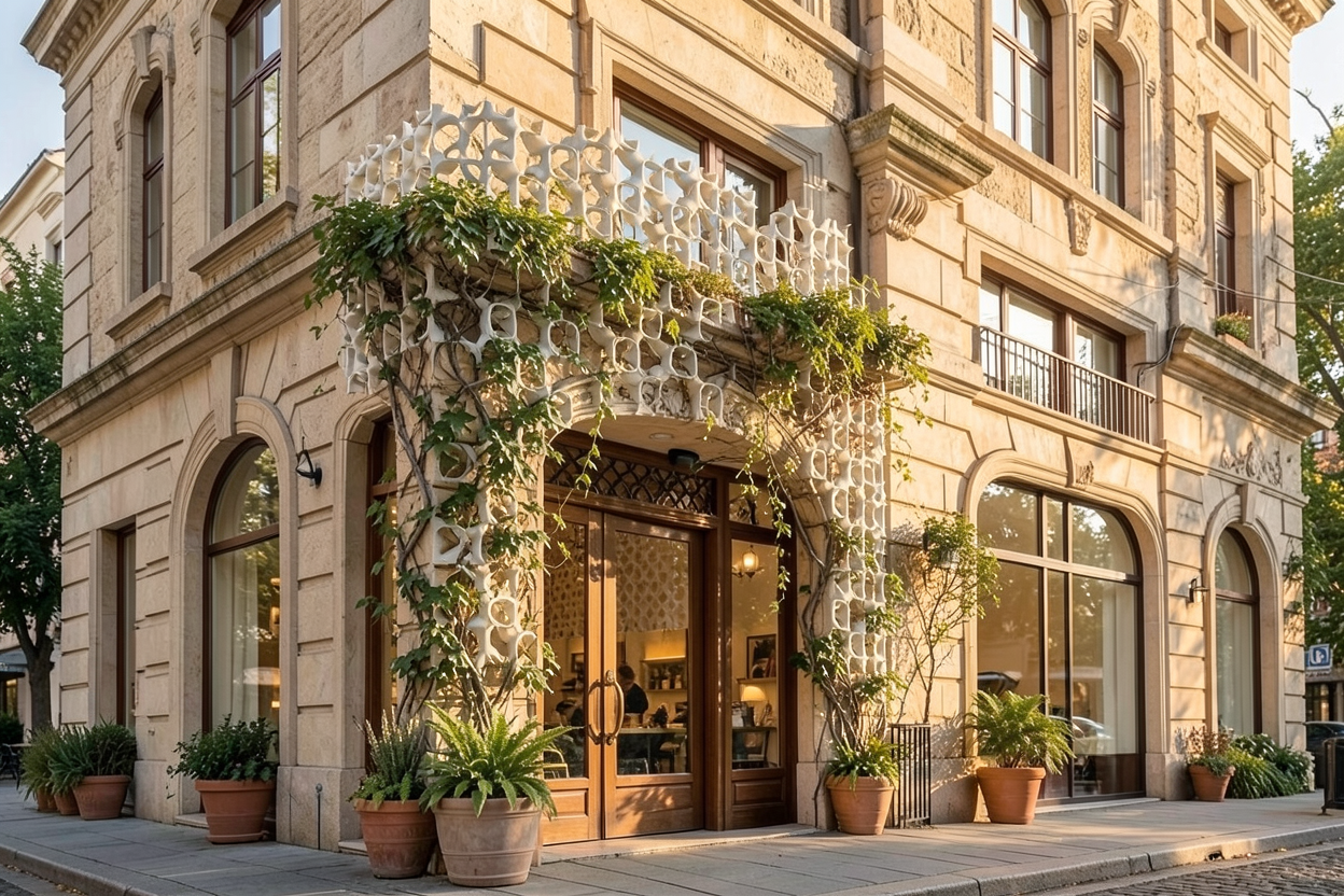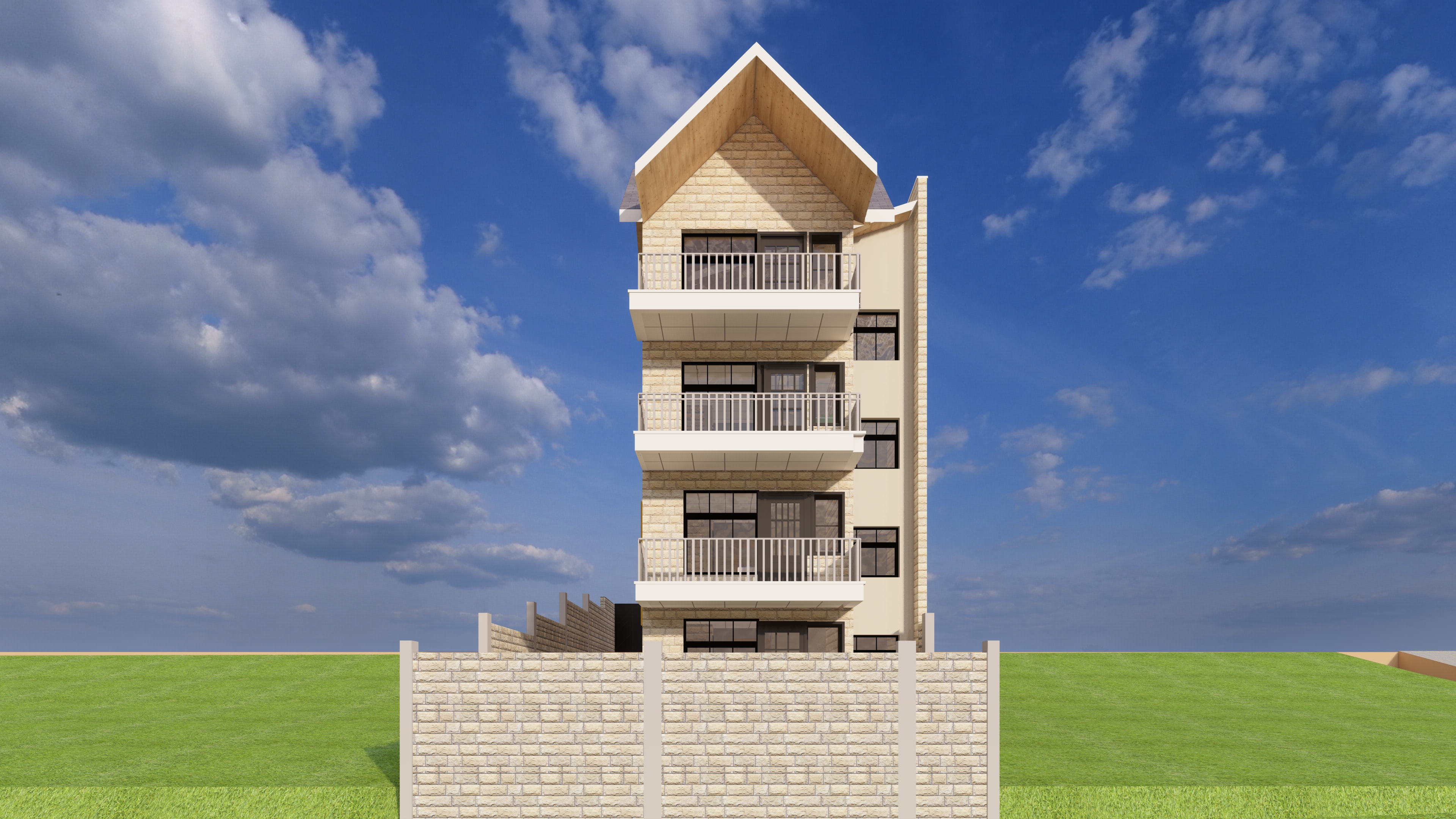 add few trees in background for context and some vegetation add warm interior lighting dim add only 2 small recessed circular lights above each balcony they should be evenly and neatly spaced