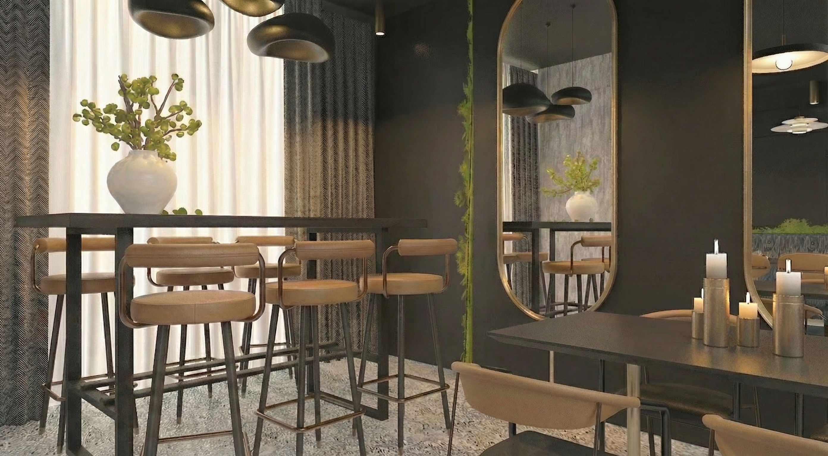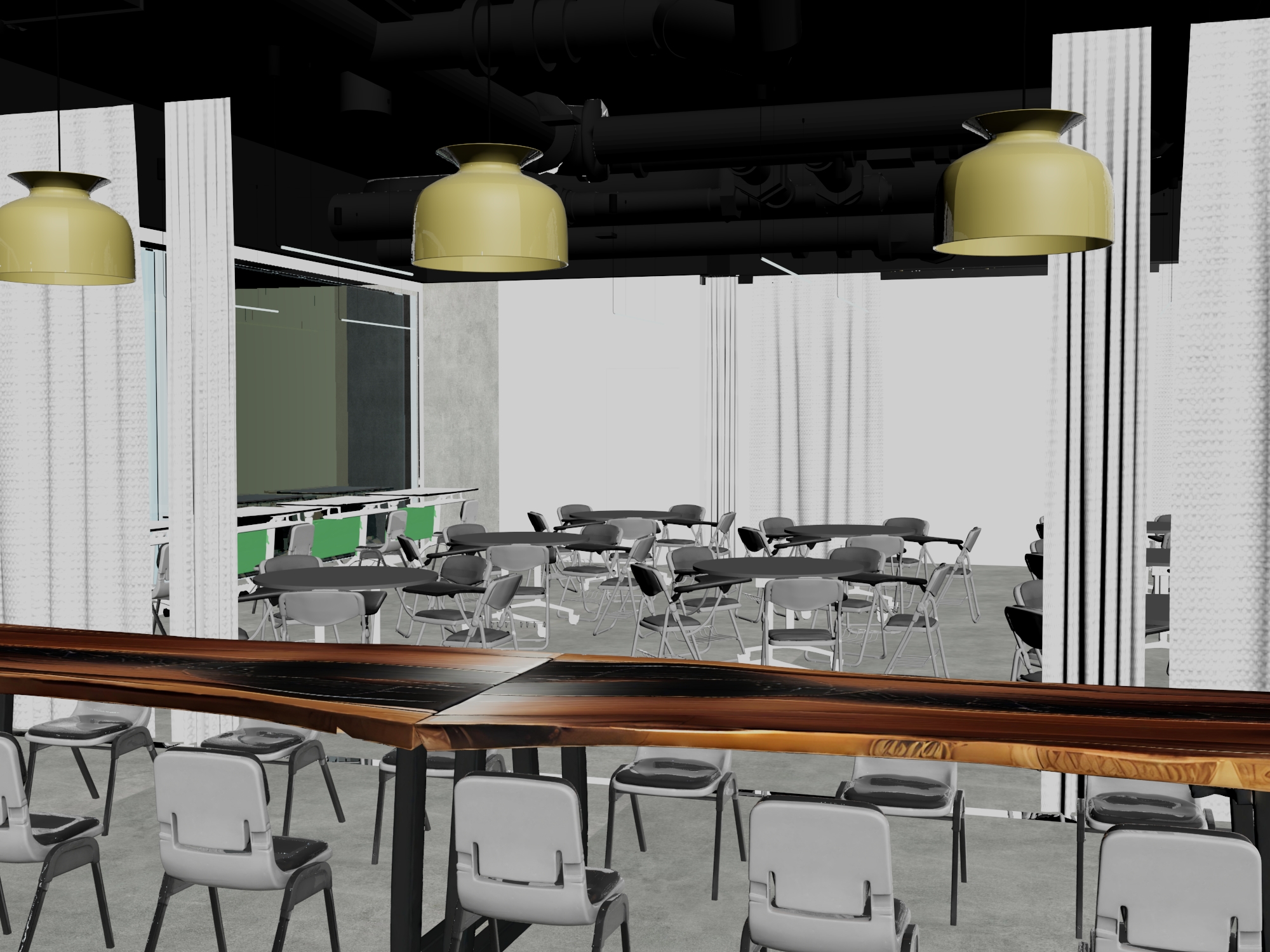 here is the final fully corrected archsynth prompt with all curtains explicitly locked as white transparent mesh and everything else unchanged and classroom accurate final archsynth prompt classroom fully locked hyper realistic architectural interior visualization ultra detailed photoreal quality modern industrial classroom interior designed for creative and technical learning with round black tables arranged for group work table legs are chrome metal with a polished reflective finish and table wheels casters are solid black matte rubber appearance realistic scale and attachment polished concrete flooring tall white textured columns and a black exposed ceiling with visible ducts and piping chairs feature grey plastic frames with black upholstered seating and backrests matte finish realistic plastic and fabric material response no color variation floor to ceiling white transparent mesh curtains installed throughout the classroom suspended between columns curtains are pure white sheer and semi transparent fine woven mesh fabric with subtle texture they softly diffuse and transmit light from the pendant lamps and linear led strips allowing clear visibility across the classroom with natural gravity driven folds and realistic draping no tint no color variation no opacity change all curtains must remain white transparent mesh warm yellow pendant lamps hanging above the classroom work zones and linear led light strips integrated into the ceiling actively illuminating the space lighting must originate only from the existing pendant lamps and linear light strips producing accurate indirect illumination realistic light falloff soft shadows and subtle reflections on chrome plastic fabric mesh and concrete surfaces teaching and production zone at the back of the classroom includes a plot cutter machine positioned behind a long wooden work counter used for instructional purposes back wall features geometric black and light wood acoustic panels supporting sound control for classroom use do not change colors materials furniture layout or proportions exact material and color fidelity required physically based rendering global illumination ray traced lighting realistic exposure correct white balance natural contrast cinematic depth sharp focus architectural photography style ultra high realism 8k quality