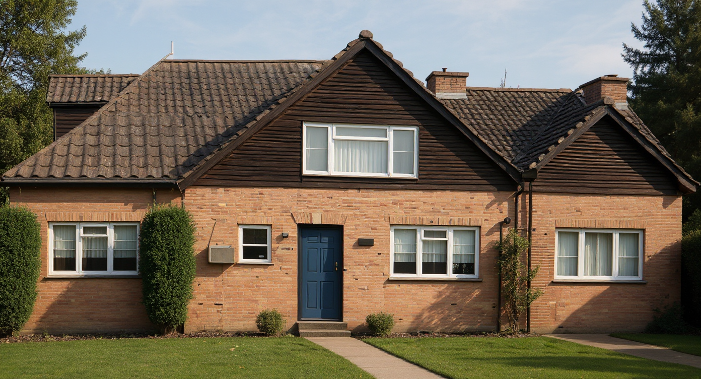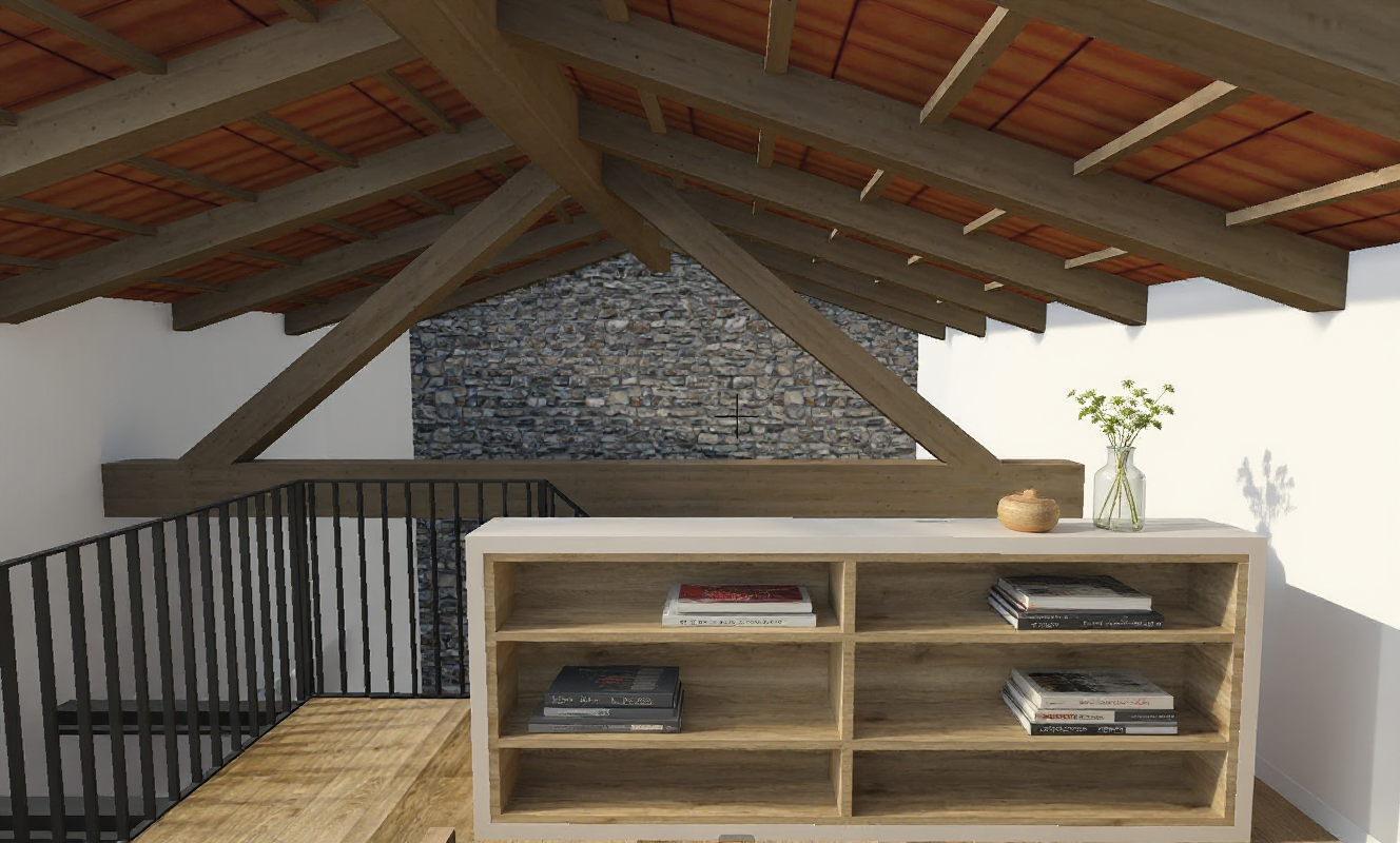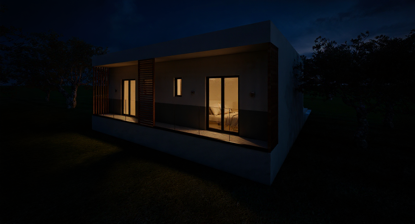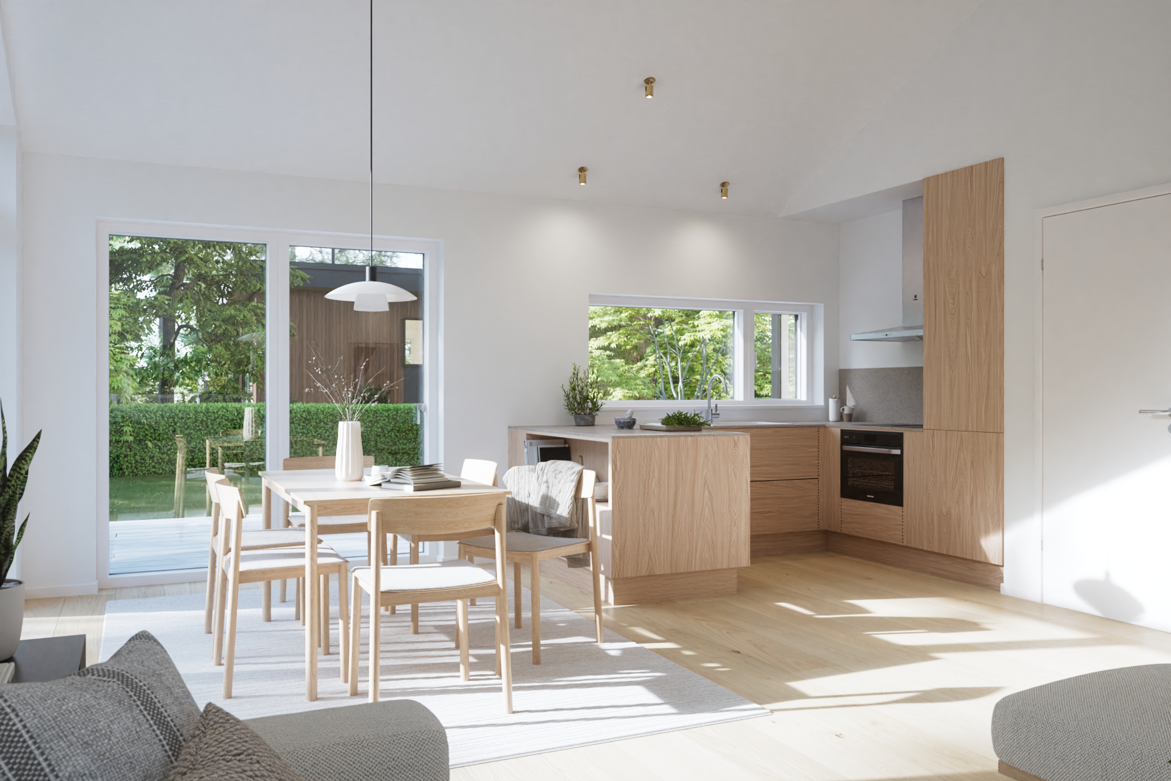 render a modern kitchen and dining area with natural light streaming in the kitchen cabinets are a darker oak wood with a sleek minimalist design the walls are painted a soft white providing a clean backdrop the dining table and chairs are also darker oak with simple elegant lines a cozy gray couch sits in the foreground adding a touch of warmth large windows offer a view of lush green trees outside enhancing the serene atmosphere the floor has a neutral oak color time of day is evening and interior lights give s soft and cozy shine the overall color palette is neutral and calming with the focus on natural textures
