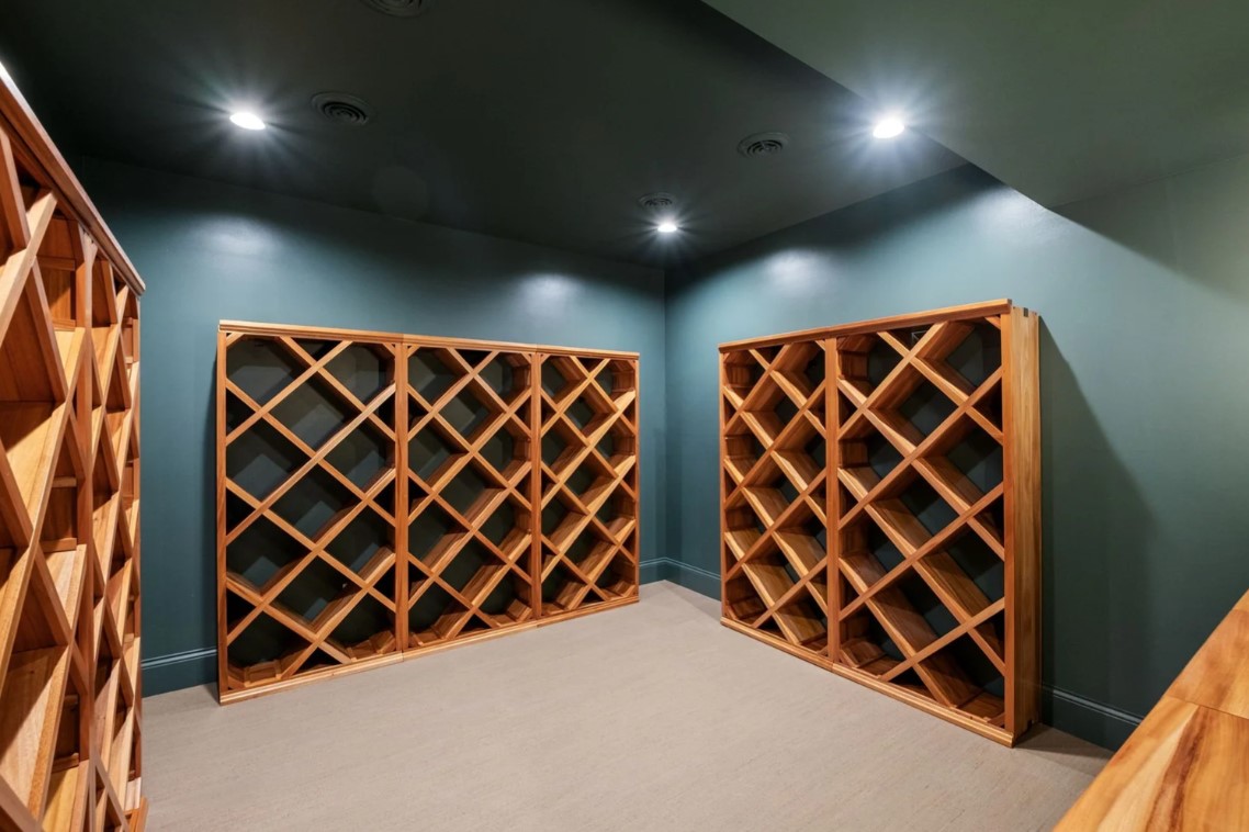 complete this wine cellar with bottles and some artwork with a wine barrel table in the middle