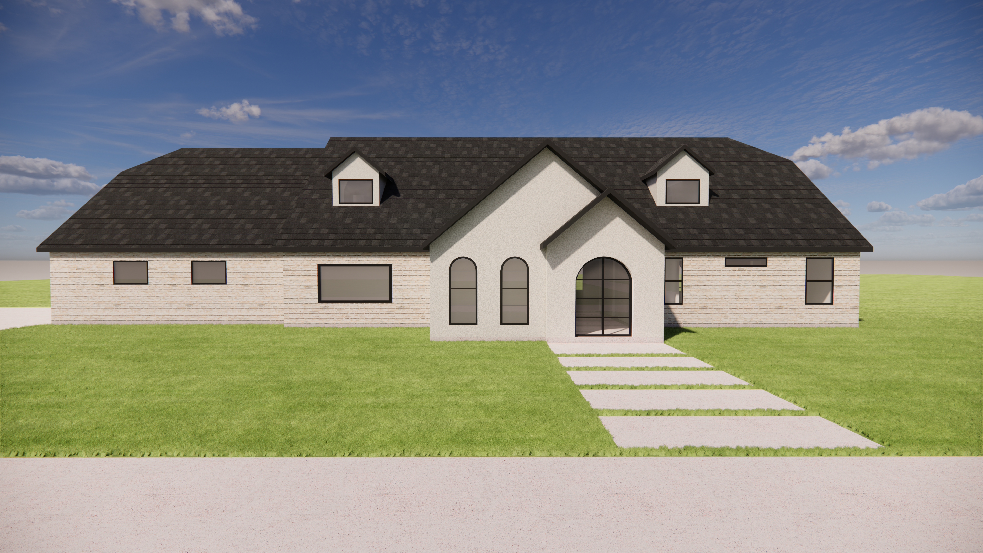 add landscaping that is minimal and modern like a spanish modern keep it sleek so not too many plants you can enhance the stucco and brick as needed but dont edit the main structure or windows add a few trees in the background as needed