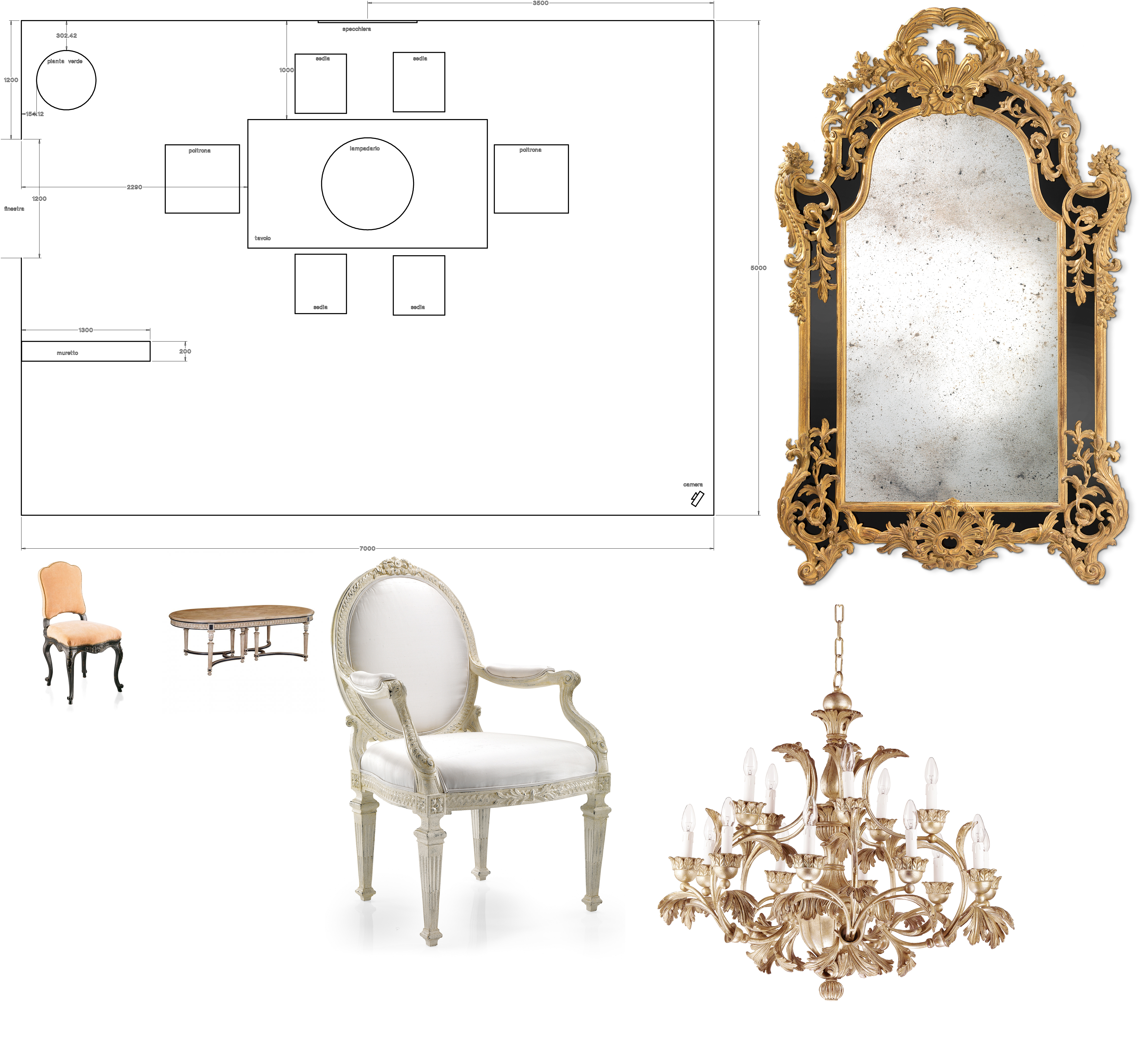 crea una sala dimensioni 7mt x 5mt x 3mt di altezza con soffitto in legno di castagno molto prezioso e cassettonato la stanza ha una finestra sul lato sinistro di dimensioni 1 20mt x1 80 mt di altezza con tende di seta beige molto fini la stanza ha anche un muretto con pietre di fiume disposto come nella mappa di dimensioni 1 3mt x 0 2mt alto 0 9mt e sopra vi appoggiato un telefono grigio a disco usa la mappa della selezione per vedere come disporre i vari elementi riproduci gli oggetti della selezione esclusa la mappa con la massima precisione il tavolo dista 1mt dalla parete centrale ed centrato sulla lunghezza della stanza misura 2 42mt x1 3 mt x 0 79 mt di altezza le sedie hanno dimensioni 0 52mt x 0 6mt x 1mt di altezza le poltrone che stanno a capotavola hanno dimensioni 0 69mt x 0 75mt x 1 mt di altezza la specchiera e nel mezzo della parete centrale e dista da terra 1 2mt le sue dimensioni sono 1mt x 1 58 mt di altezza il lampadario che posto al centro del tavolo ad un altezza di 2mt da terra ha un diametro di 0 93mt ed un altezza di 0 84mt nell angolo opposto alla camera di ripresa alle misure indicate nella mappa crea un vaso bianco in porcellana di diametro 0 6mt che contiene una grande pianta verde la camera di ripresa invece nell angolo basso a destra della mappa la luce calda e soffusa del tardo pomeriggio il lampadario acceso riprendi tutta la scena descritta e rirpoduci con un formato 16 9 grazie