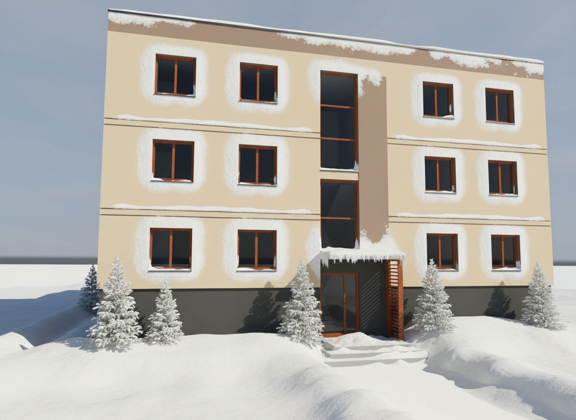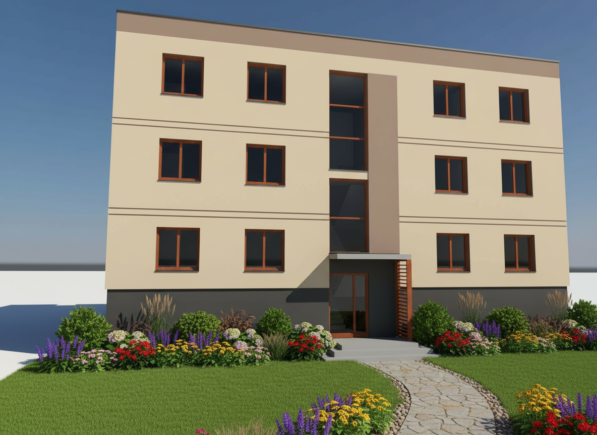 create a highly realistic architectural elevation render of the provided building strictly retain all existing materials colors textures and finishes exactly as shown do not alter replace or enhance the fa ade materials in any way preserve all architectural details proportions and surface finishes accurately use natural daylight with balanced brightness soft realistic shadows and proper light direction to create depth apply neutral true to life color grading with controlled contrast add subtle realistic plants and soft greenery in the background only such as trees shrubs or landscape silhouettes to enhance scale and context without distracting from the elevation include a realistic sky backdrop ensure crisp detailing realistic material reflections and a clean professional architectural visualization