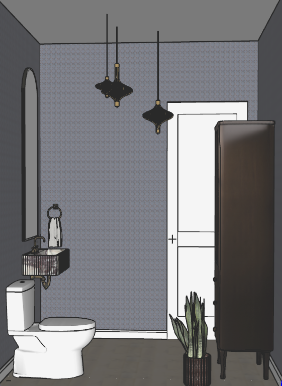 floor is a matte oak hardwood the wallpaper has a blue linen with copper circles the sink is a calcatta marble with dark veins