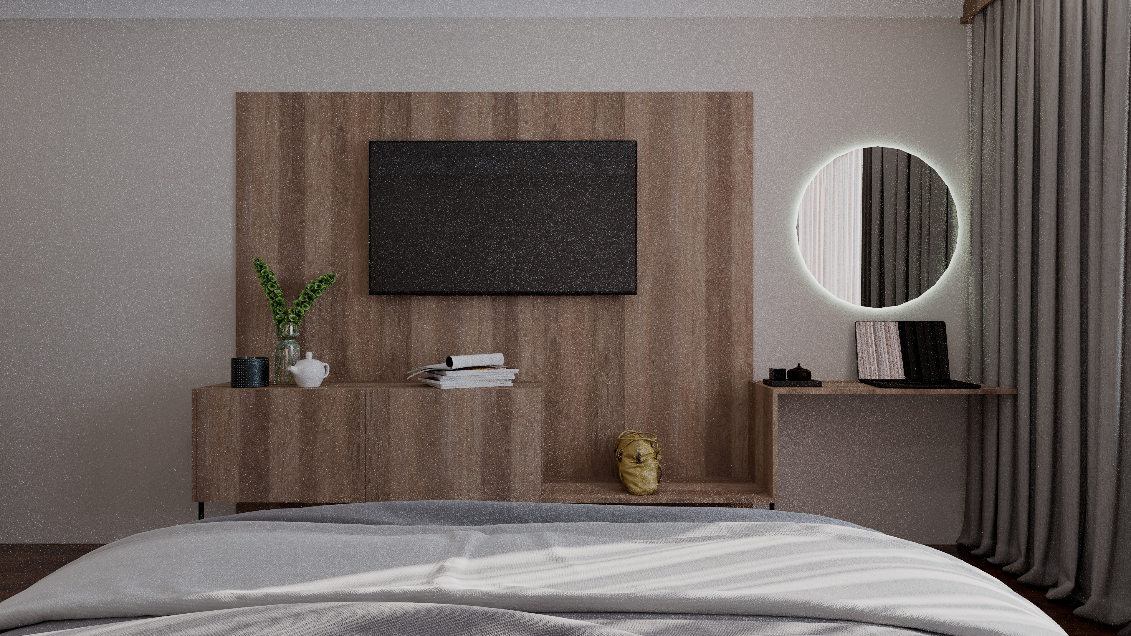ultra photorealistic super high quality interior render of this exact bedroom view keeping the same camera angle composition furniture placement architecture proportions and design geometry completely unchanged all visible wood surfaces must be natural oak wood veneer with a warm light to medium oak tone elegant realistic oak grain subtle tonal variation refined texture depth and a premium matte finish the oak should feel natural warm soft and high end not dark not walnut not orange not yellow not grey and not rustic apply this same natural oak veneer consistently to the tv back panel lower cabinet desk shelves and all visible wood millwork the floor should also read as warm natural oak parquet with realistic grain and a refined matte finish keep the curtains in the same position and design but make them more realistic with proper fabric weight soft folds and natural drape keep the mirror light soft and realistic maintain a clean luxury hotel atmosphere with soft natural daylight realistic global illumination balanced contrast natural bounce light soft shadows refined highlights realistic reflections and premium architectural visualization quality render it cinematic elegant physically accurate and extremely detailed do not change the layout do not change the design do not move furniture do not alter proportions do not add or remove objects do not redesign any element and do not reinterpret the room only improve realism and make all wood read as natural oak veneer in super high quality render negative prompt no walnut wood no dark brown wood no grey wood no orange wood no yellow wood no glossy finish no rustic texture no exaggerated grain no redesign no layout change no furniture change no camera change no material drift no low quality rendering no flat lighting no stylized look
