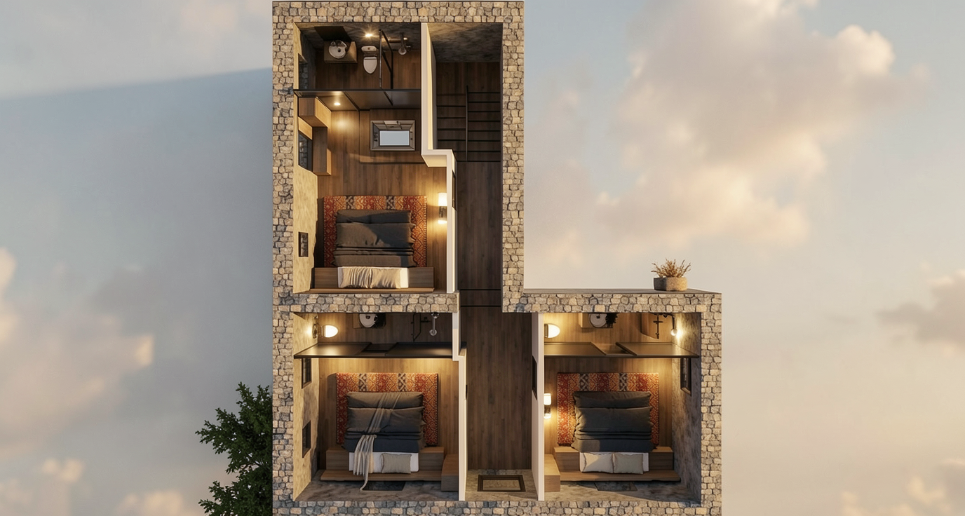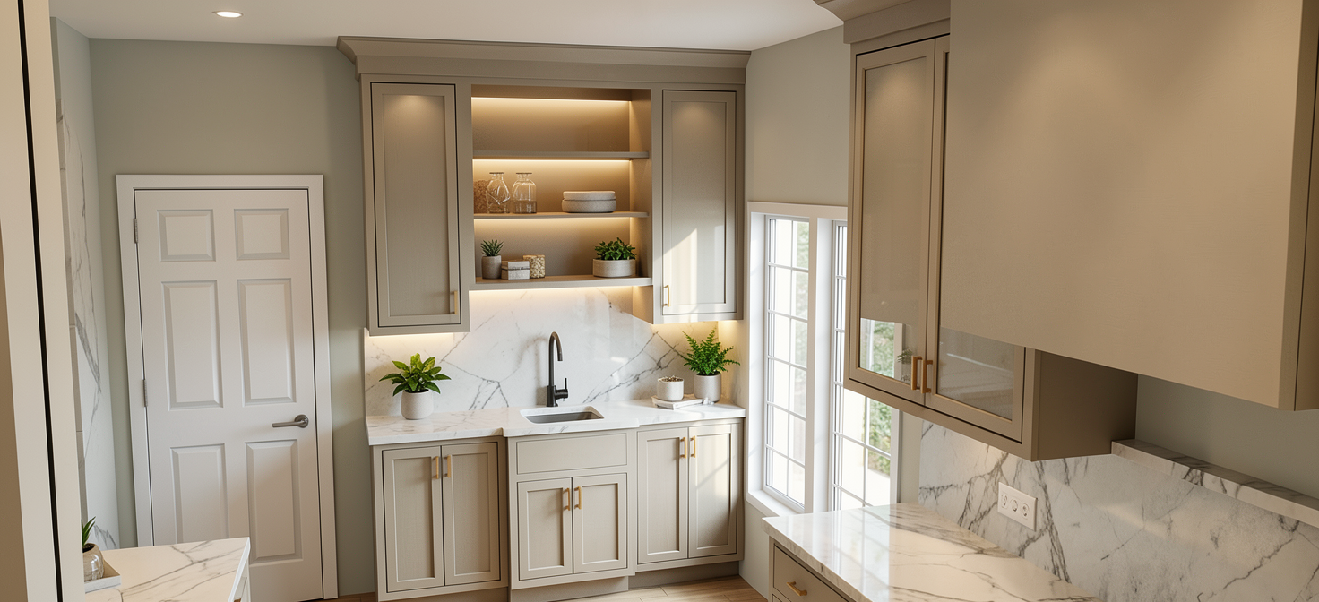 make a photorealistic image keep the colors do not add anything to the image leather sofa brown gold details wardrobe color angora beige egger
