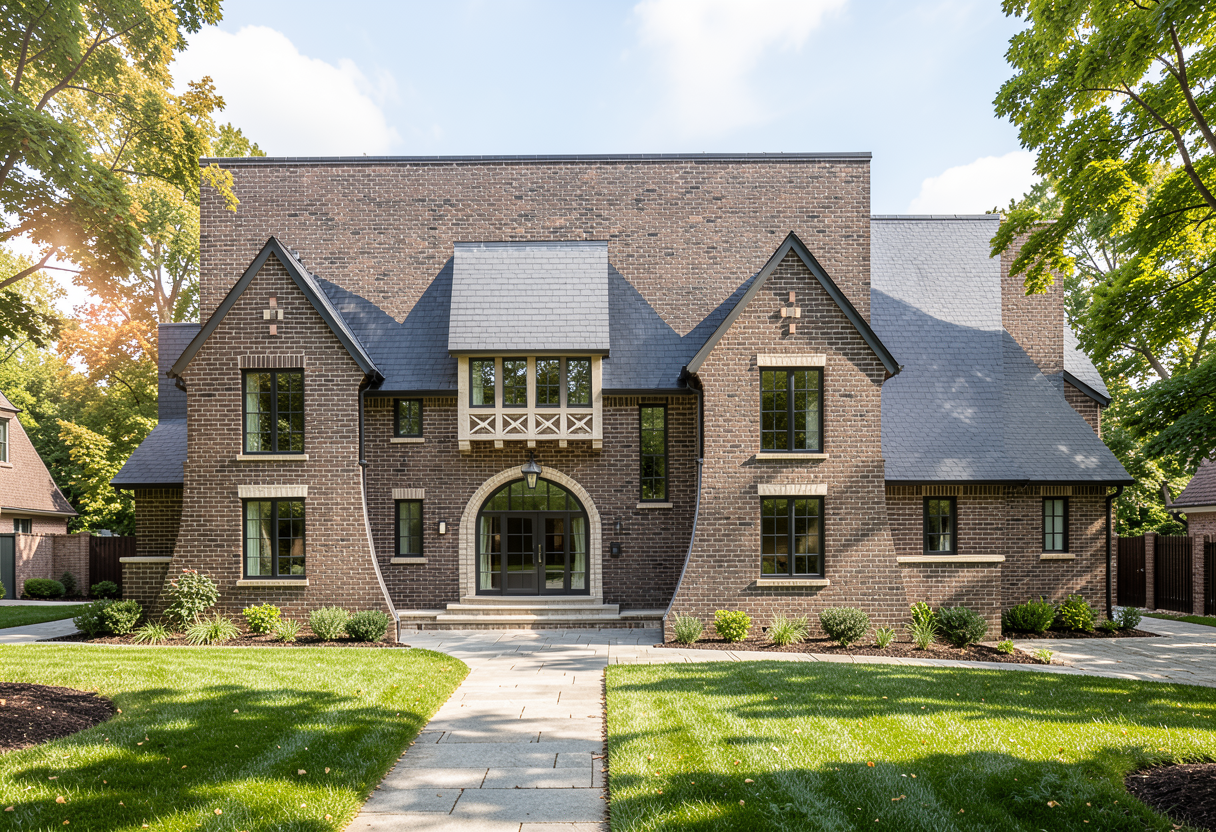 design this house to be a modern transitional home with brown gray brick and cast stone lintels above the windows add large wooden brackets to the sides of the dormer windows