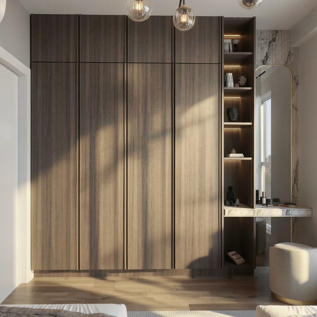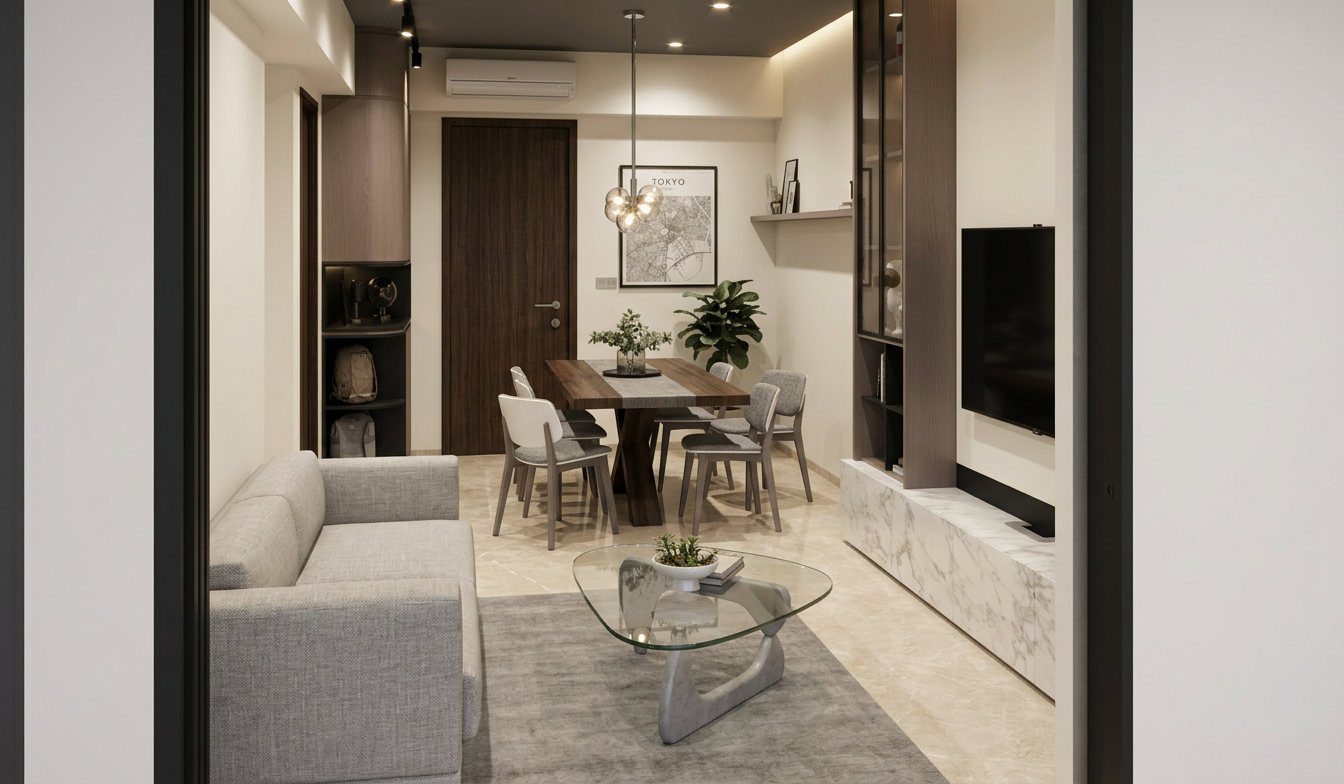 photorealistic render of a compact scandinavian style studio apartment interior viewed diagonally from near a floor to ceiling wardrobe divider toward the window seating area the composition shows the sleeping zone in the foreground and the living corner near the window the floor is light natural oak parquet laid in a herringbone pattern adding warmth and texture walls are smooth matte off white creating a bright minimalist atmosphere sleeping area on the left side of the room stands a white wooden daybed with a vertical slat backrest functioning as both sofa and bed the bedding is white with soft white pillows and a mustard yellow fluffy throw blanket draped casually across the mattress the bed base includes integrated storage drawers lounge area at the center of the room is a small lounge arrangement placed on a round light beige fabric rug the seating consists of a mustard yellow two seat sofa with vertical channel tufting a light cream upholstered lounge chair between the seats are two nested oval coffee tables with thin wooden legs and white tabletops styled with a small decorative tray and objects next to the sofa stands a tall arc floor lamp with a curved golden arm and dome shade extending above the seating area behind the seating area leaning against the wall is a large rectangular floor mirror with a thin silver grey frame window and dining corner the far wall contains large windows allowing soft natural daylight to enter the room with a white radiator positioned below the window near the window stands a small round dining table with a white tabletop and a single grey silver pedestal base paired with a white molded chair with wooden legs exterior view visible through the windows is a large green park with mature tall trees and dense foliage the apartment is located on the first floor so the tree canopies and park landscape appear close to the windows providing a calm natural view and soft diffused daylight entering the interior storage divider on the right side of the frame stands a large floor to ceiling wardrobe divider with light wood panels framed by thin grey lines and white accent bands forming a modern geometric panel pattern lighting lighting is soft natural daylight from the park outside combined with gentle ambient interior light creating a cozy airy scandinavian atmosphere rendering style photorealistic architectural interior visualization global illumination soft daylight ray traced reflections realistic fabric and wood textures interior photography style 35mm lens ultra detailed materials high dynamic range lighting