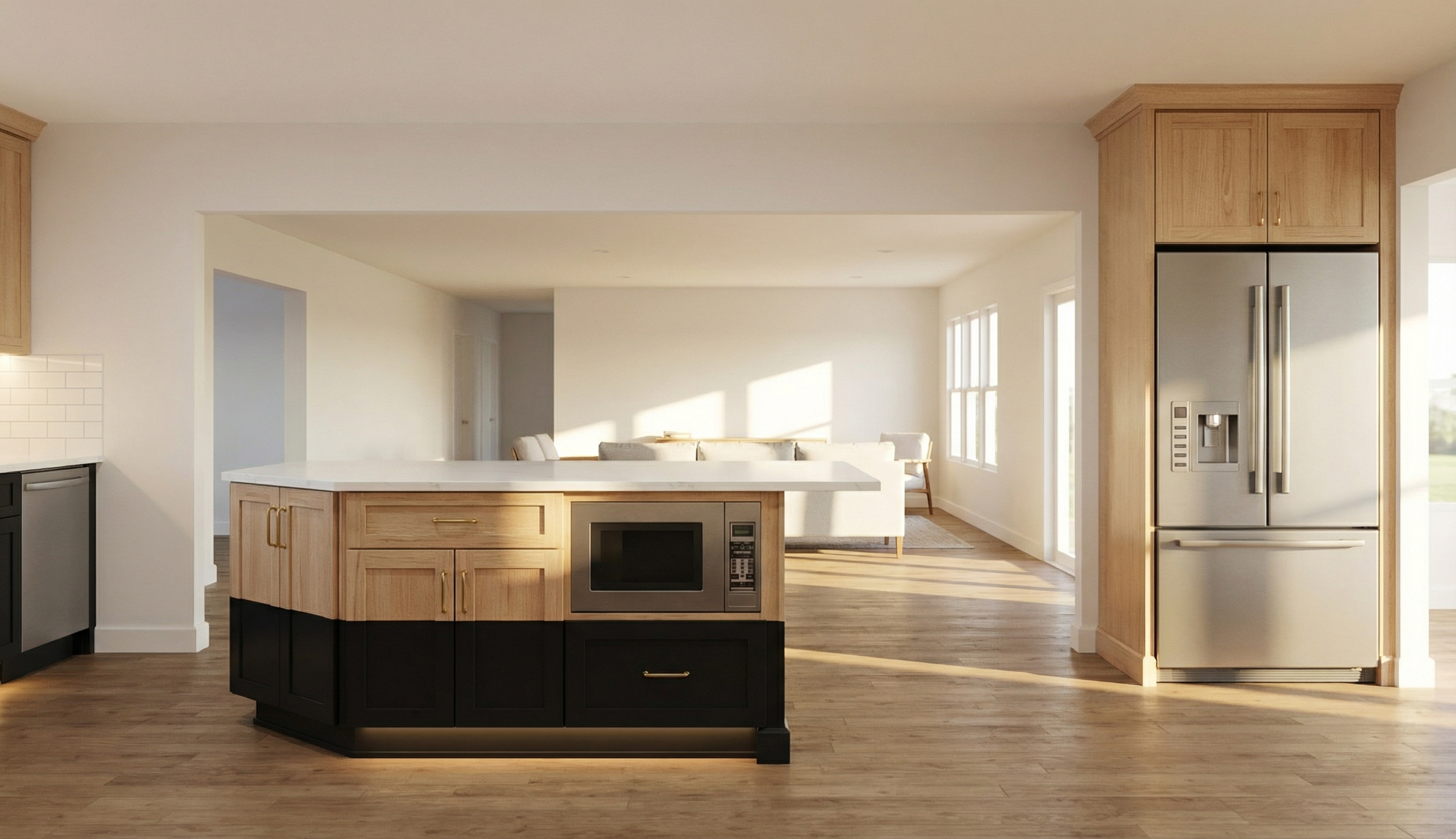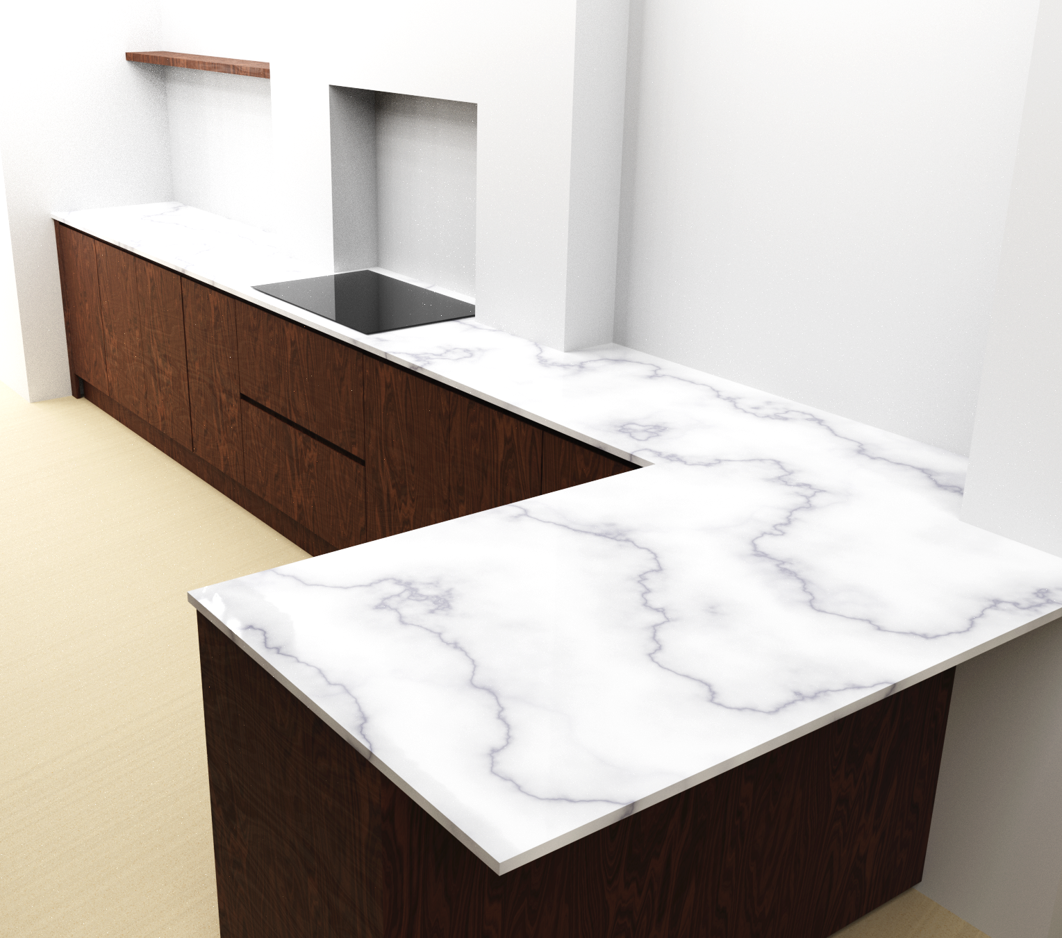 walnut door fronts simple white marble counters and splash back