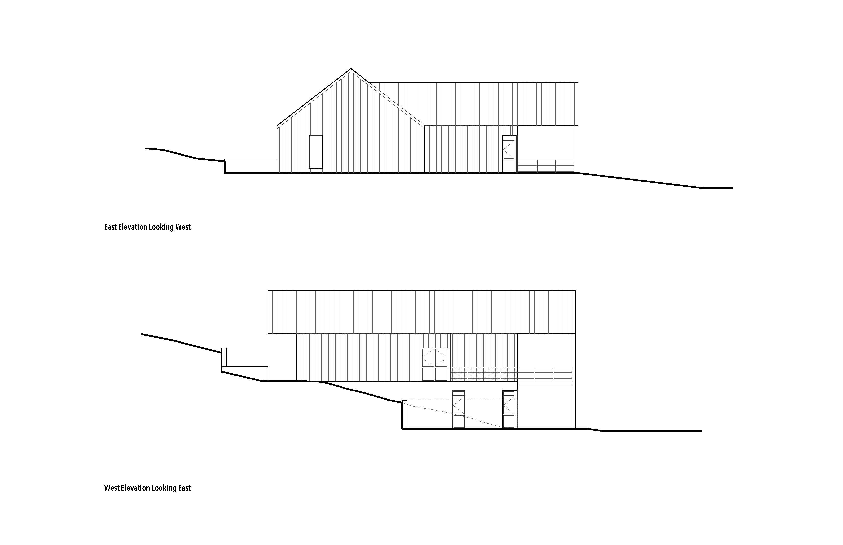 concrete base gray cedar siding above wooded site elevation side view