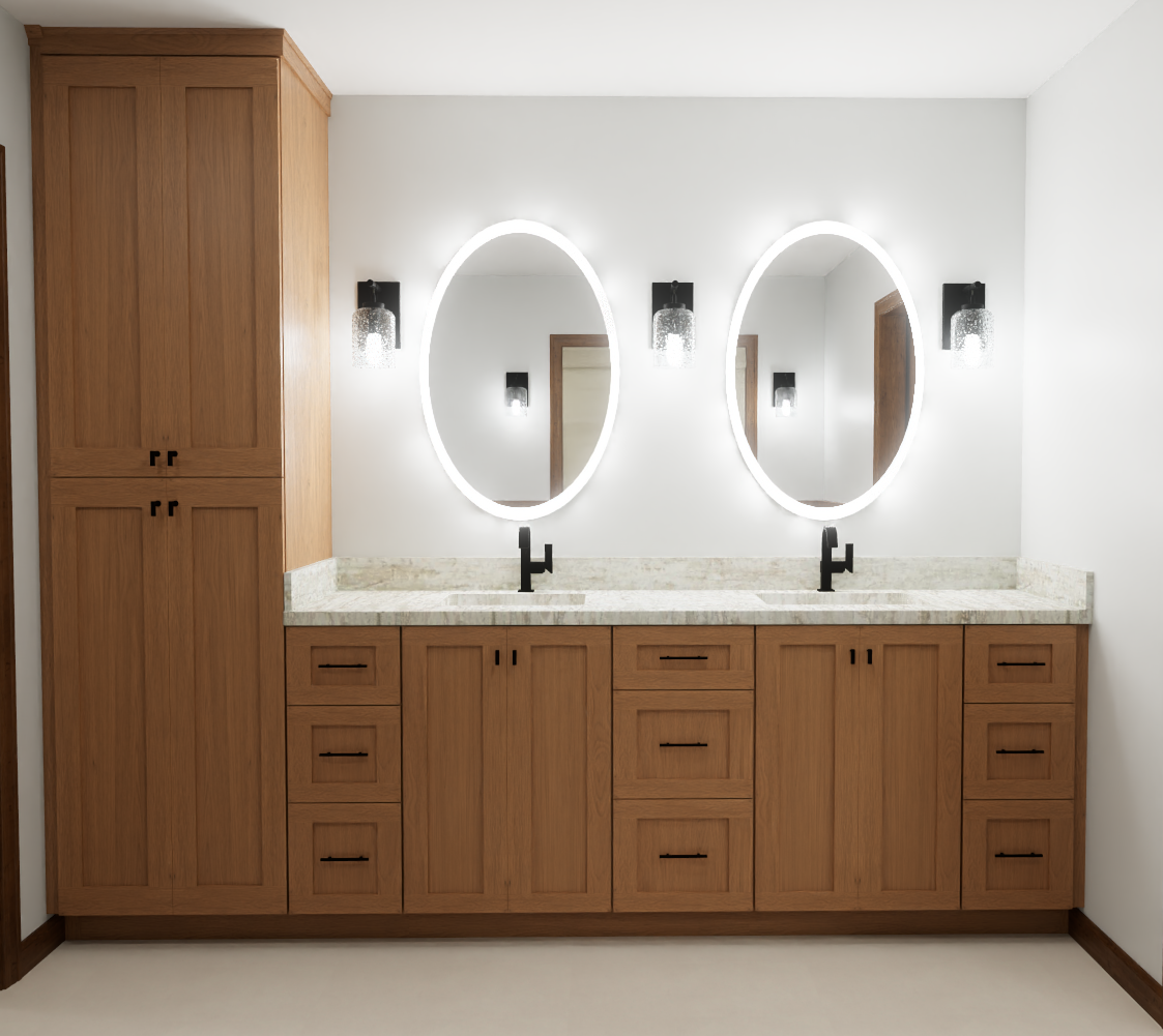 rustic modern boho bathroom beige tile floors with a photorealistic polished granite ivory cream base taupe and gray crystalline texture bold charcoal and black mineral deposits irregular brecciated pattern natural fractured stone movement high contrast luxury countertop slab