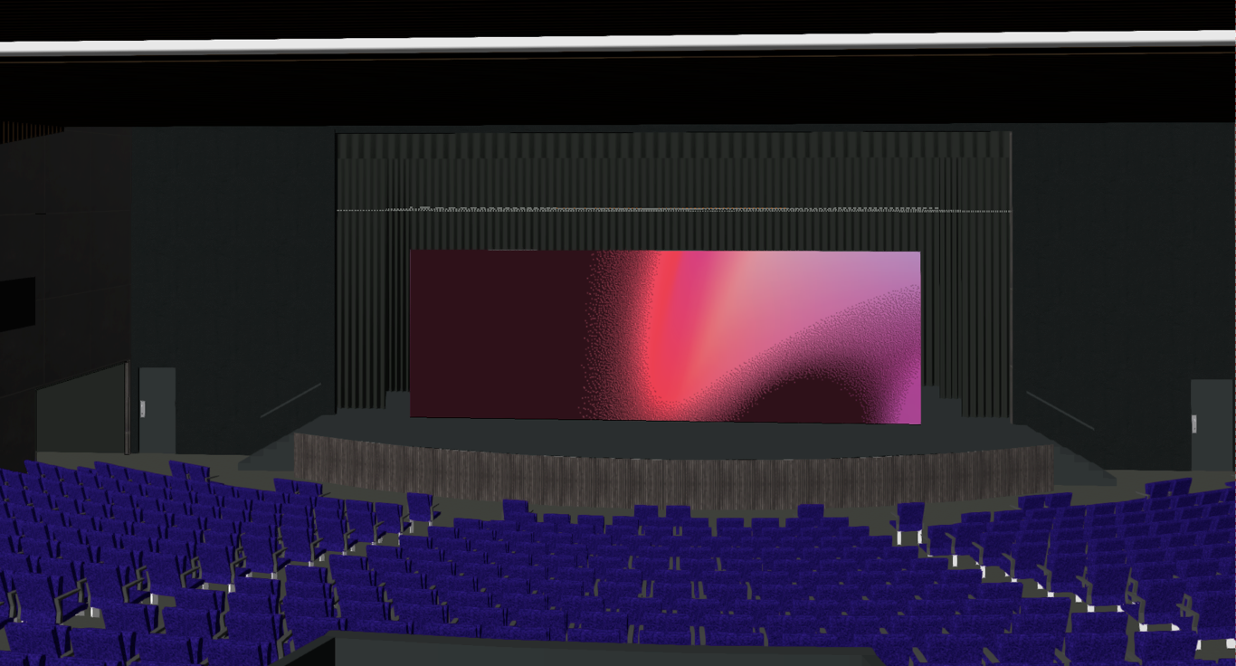 make it realistic mantain materials and space with black drape mantain image on the led screen add person on stage add audiece add a bit of pink salmon colour behind screen keep the ambient dark