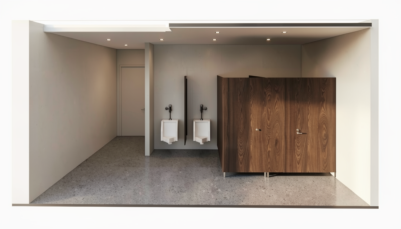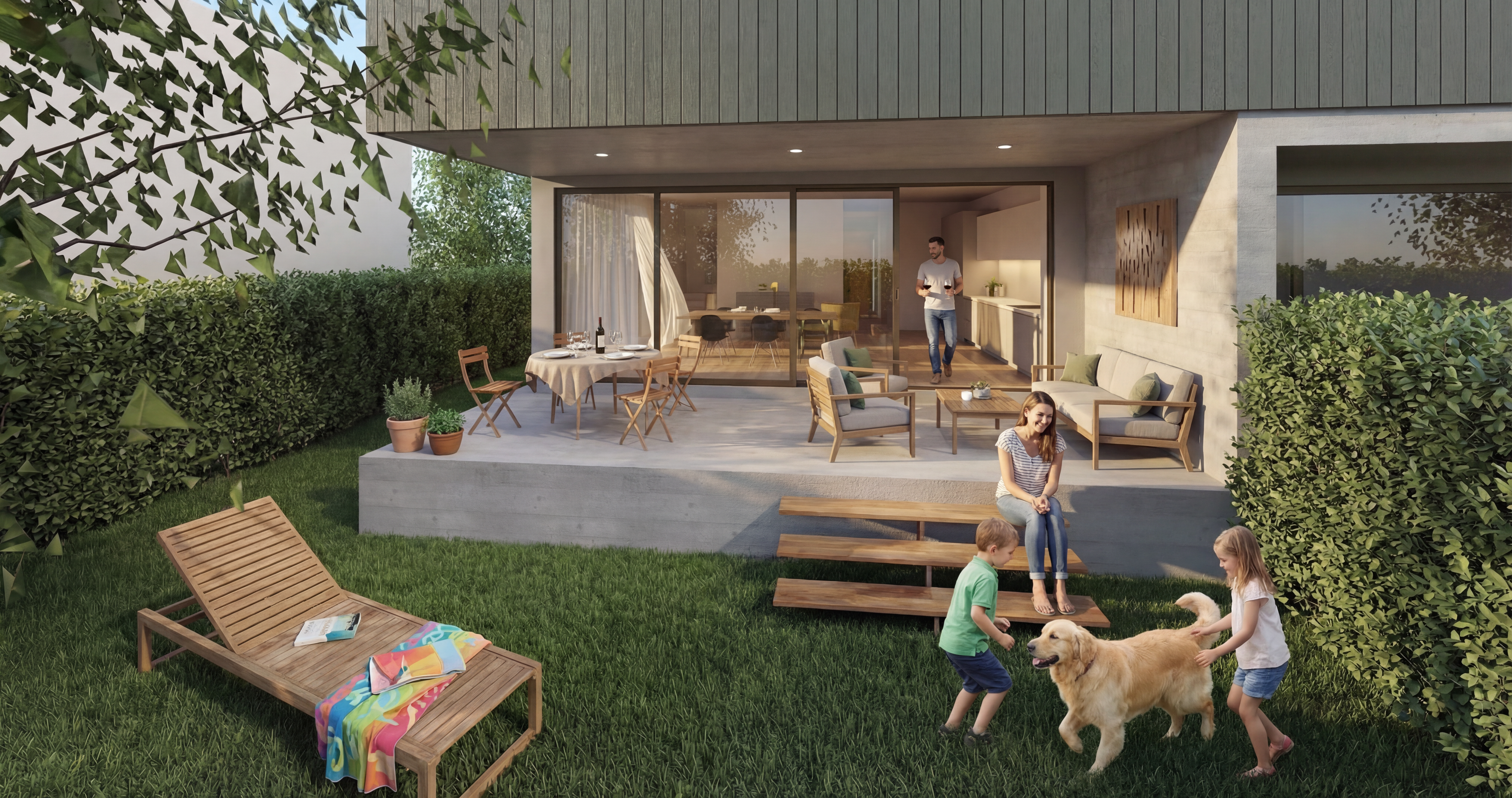 a modern architectural building with a sleek minimalist design the structure features a combination of white and light gray concrete walls with warm wooden panel accents large glass windows allow natural light to flood the interior reflecting the surrounding environment the building is set against a bright blue sky with fluffy white clouds adding a fresh airy atmosphere the surrounding landscape is a mix of smooth gray pavement and light green grass enhancing the modern eco friendly feel people are walking near the building adding a sense of community and liveliness to the scene