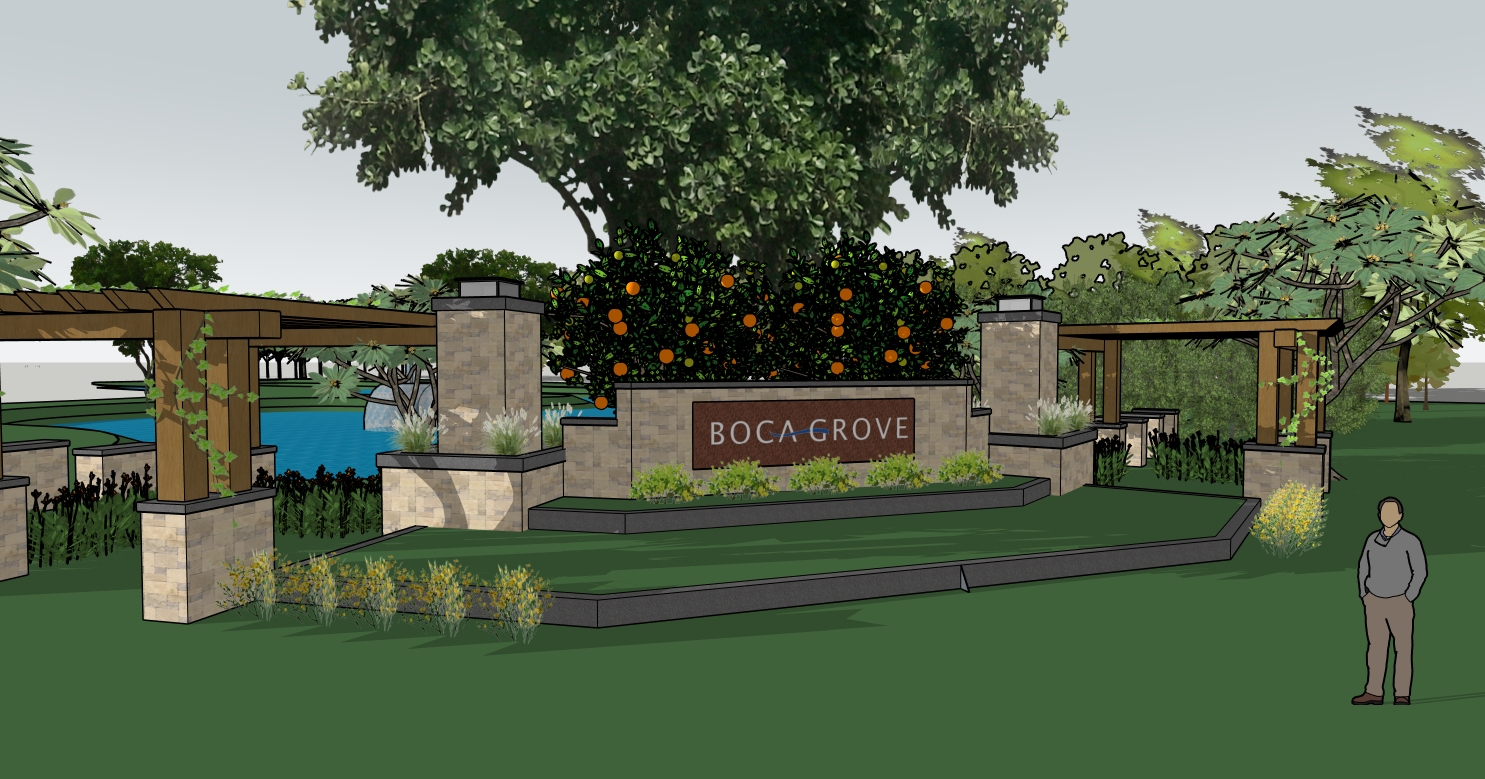 earth tone stone cypress wood trellis low ground cover and grass south florida
