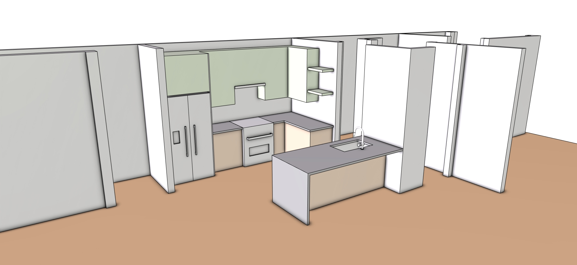 light white oak cabinets with thin shaker style doors white painted walls medium dark grey countertops with white veins countertop has a waterfall on the outside edge of the peninsula countertop stainless steel luxury appliances wood floors dark grey tile backsplash with trapezoid shape tiles