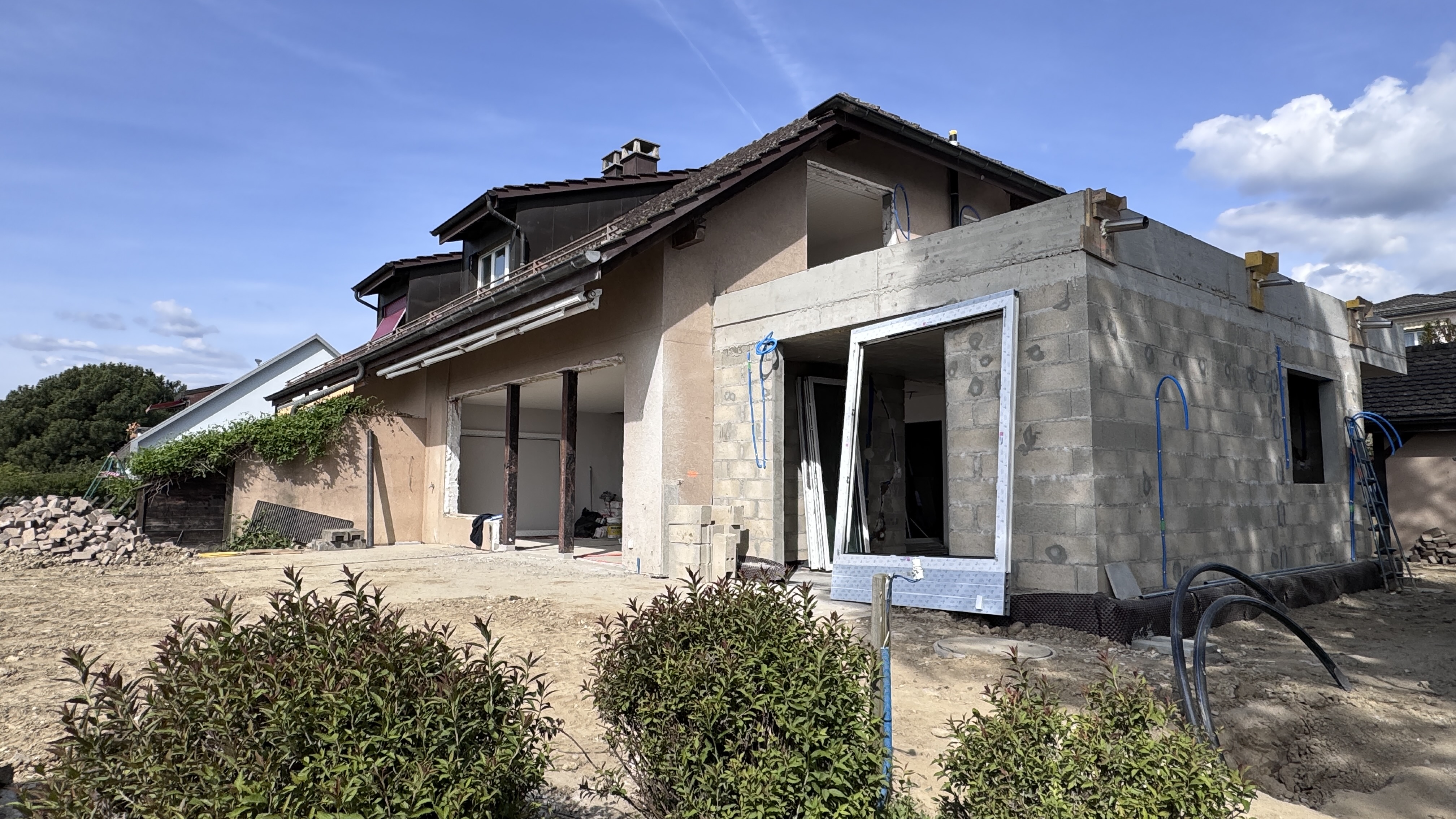 finis la maison enduit blanc cass sur les murs fenetres et boiseries en gris moyen mets du gazon et quelques fleurs terrasse carrelage imitation bois gris