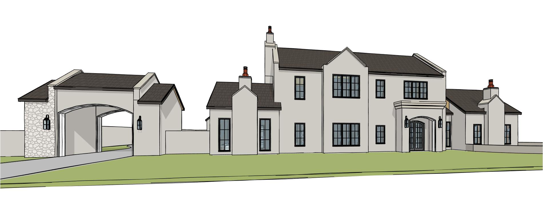 english manor weathered stone shake roof vines growing on side english gardens in front sketchy pencil drawing