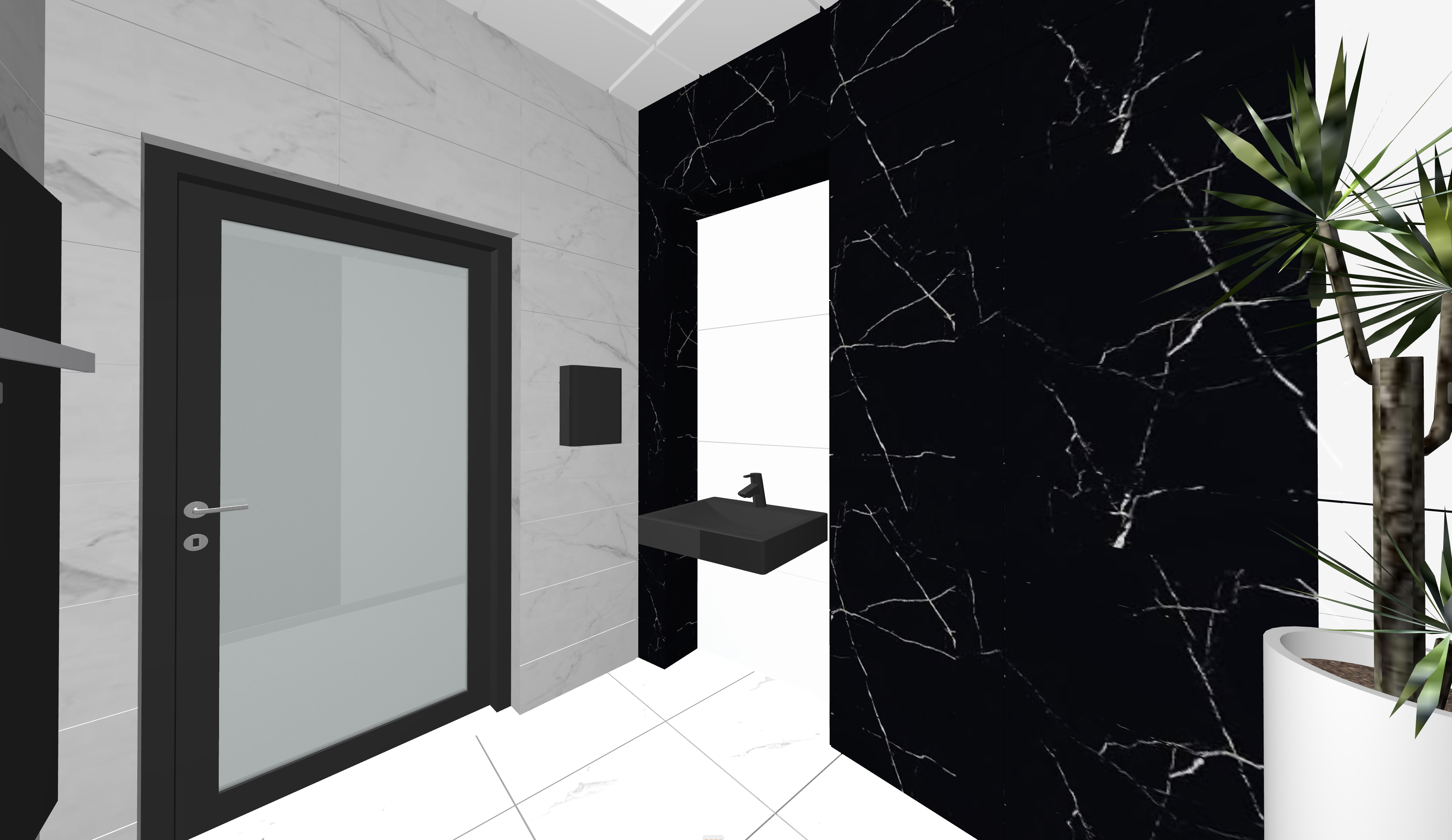 interior from the top white and black stone on the walls make a vertical mirror behind the sink and a flower pot architecture