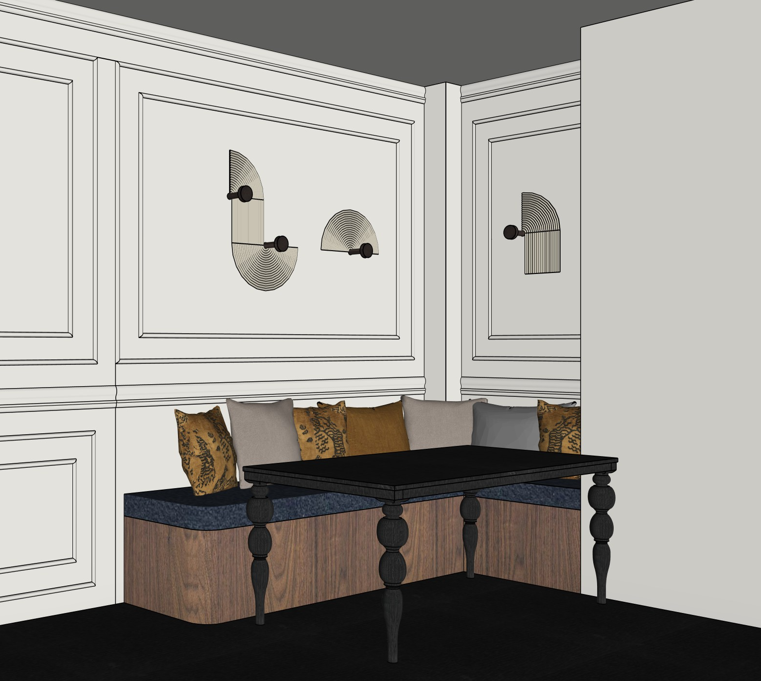 the appartment is on the 6th floor in a parisian building the walls are in very light greige the floor is in black wood the blue cushions of the bench are in dark blue velvet and should cover the entirety of the bench including its rounded end the table is in black oak the ceiling is in the same color as the walls there is no panther print on the cushions the lights are the tapis model from wever ducre style like athena caldrone