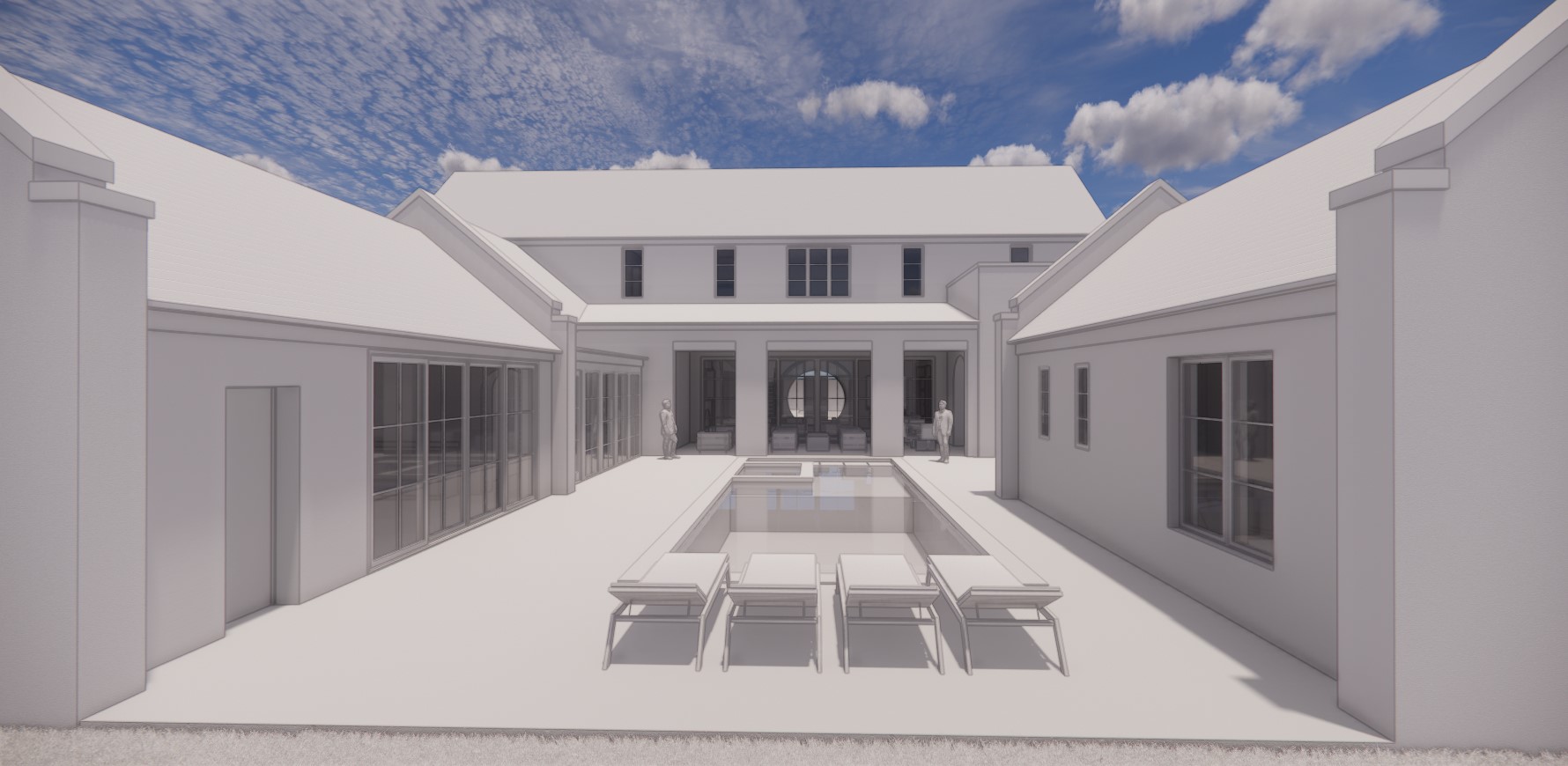 white stucco parapet walls with concrete caps soft blue sunset sky with hues of pink and orange scattered clouds narrow framed dark steel windows with dark trim very small black river stones in lawn no grass up light house more lighting through windows more ambient brightness on house make overall image brighter more light coming through windows make overall image brighter more brightness on the house modern patio paving in foreground